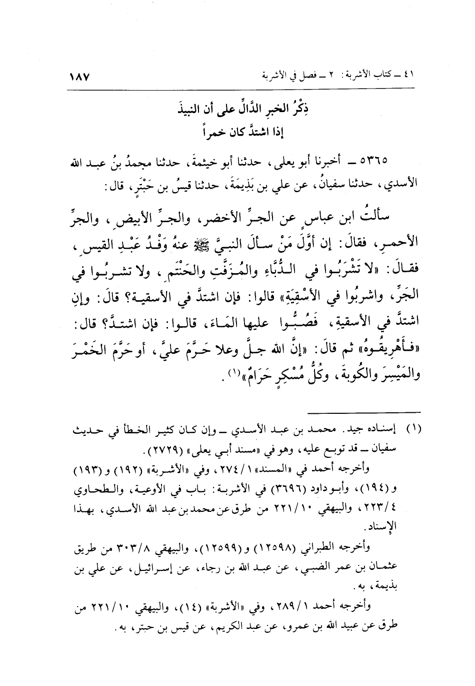 سَأَلْتُ ابْنَ عَبَّاسٍ عَنِ الْجَرِّ الْأَخْضَرِ, وَالْجَرِّ الْأَبْيَضِ, وَالْجَرِّ الْأَحْمَرِ, فَقَالَ: إِنَّ أَوَّلَ مَنْ سَأَلَ النَّبِيَّ صَلَّى اللَّهُ عَلَيْهِ وَسَلَّمَ عَنْهُ وَفْدُ عَبْدِ الْقَيْسِ, فَقَالَ: "لَا تَشْرَبُوا فِي الدُّبَّاءِ وَالْمُزَفَّتِ وَالْحَنْتَمِ, وَلَا تَشْرَبُوا فِي الْجَرِّ, وَاشْرَبُوا فِي الْأَسْقِيَةِ" قَالُوا: فَإِنِ اشْتَدَّ فِي الْأَسْقِيَةِ؟ قَالَ: وَإِنِ اشْتَدَّ فِي الْأَسْقِيَةِ, فَصُبُّوا عَلَيْهَا الْمَاءَ, قَالُوا: فَإِنِ اشْتَدَّ؟ قَالَ: "فَأَهْرِيقُوهُ" ثُمَّ قَالَ: "إِنَّ اللَّهَ جَلَّ وَعَلَا حَرَّمَ عَلَيَّ, أَوْ حَرَّمَ الْخَمْرَ وَالْمَيْسِرَ وَالْكُوبَةَ, وكل مسكر حرام" 1.