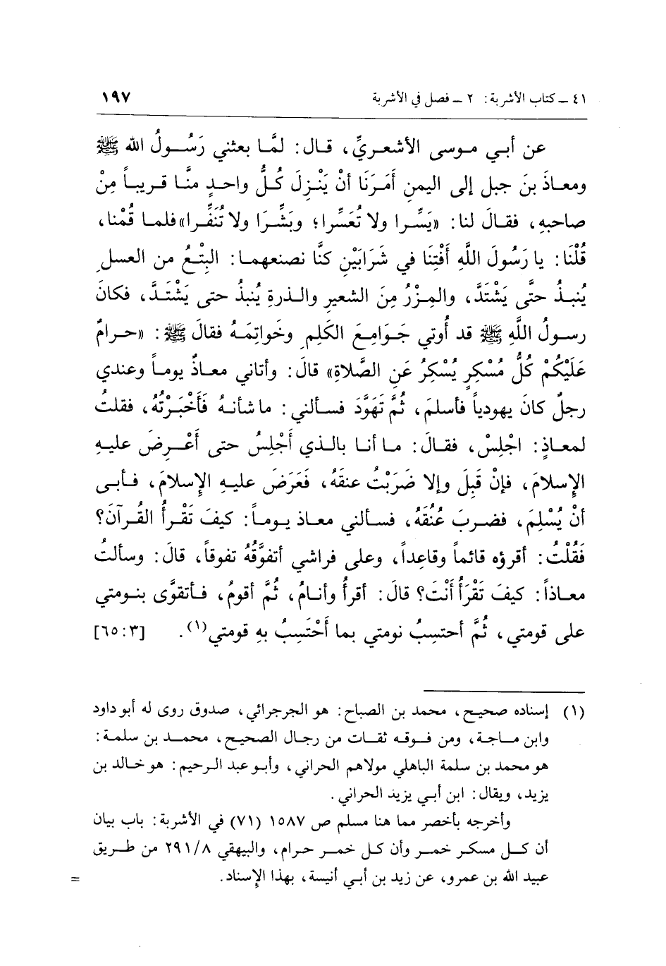 عَنْ أَبِي مُوسَى الْأَشْعَرِيِّ, قَالَ: لَمَّا بَعَثَنِي رَسُولُ اللَّهِ صَلَّى اللَّهُ عَلَيْهِ وَسَلَّمَ وَمُعَاذَ بْنَ جَبَلٍ إِلَى الْيَمَنِ أَمَرَنَا أَنْ يَنْزِلَ كل واحد منا قريا مِنْ صَاحِبِهِ, فَقَالَ لَنَا: "يَسِّرَا وَلَا تُعَسِّرَا؛ وَبَشِّرَا وَلَا تُنَفِّرَا" فَلَمَّا قُمْنَا, قُلْنَا: يَا رَسُولَ اللَّهِ أَفْتِنَا فِي شَرَابَيْنِ كُنَّا نَصْنَعُهُمَا: الْبِتْعُ مِنَ الْعَسَلِ يُنْبَذُ حَتَّى يَشْتَدَّ, وَالْمِزْرُ مِنَ الشَّعِيرِ وَالذُّرَةِ يُنْبَذُ حَتَّى يَشْتَدَّ, فَكَانَ رَسُولُ اللَّهِ صَلَّى اللَّهُ عَلَيْهِ وَسَلَّمَ قَدْ أوتي جوامع الكلم وخواتمه فَقَالَ رَسُولُ اللَّهِ صَلَّى اللَّهُ عَلَيْهِ وَسَلَّمَ: "حَرَامٌ عَلَيْكُمْ كُلُّ مُسْكِرٍ يُسْكِرُ عَنِ الصَّلَاةِ" قَالَ: وَأَتَانِي مُعَاذٌ يَوْمًا وَعِنْدِي رَجُلٌ كَانَ يهودي فَأَسْلَمَ, ثُمَّ تَهَوَّدَ فَسَأَلَنِي: مَا شَأْنُهُ فَأَخْبَرْتُهُ, فَقُلْتُ لِمُعَاذٍ: اجْلِسْ, فَقَالَ: مَا أَنَا بِالَّذِي أَجْلِسُ حَتَّى أَعْرِضَ عَلَيْهِ الْإِسْلَامَ, فَإِنْ قَبِلَ وإلا ضَرَبْتُ عُنُقَهُ, فَعَرَضَ عَلَيْهِ الْإِسْلَامَ, فَأَبَى أَنْ يُسْلِمَ, فَضَرَبَ عُنُقَهُ, فَسَأَلَنِي مُعَاذٌ يَوْمًا: كَيْفَ تَقْرَأُ الْقُرْآنَ؟ فَقُلْتُ: أَقْرَؤُهُ قَائِمًا وَقَاعِدًا, وَعَلَى فِرَاشِي أَتَفَوَّقُهُ تَفَوُّقًا, قَالَ: وَسَأَلْتُ مُعَاذًا: كَيْفَ تَقْرَأُ أَنْتَ؟ قَالَ: أَقْرَأُ وَأَنَامُ, ثُمَّ أَقُومُ, فَأَتَقَوَّى بِنَوْمَتِي عَلَى قَوْمَتِي, ثُمَّ أَحْتَسِبُ نَوْمَتِي بما أحتسب قومتي 1. [65:3]