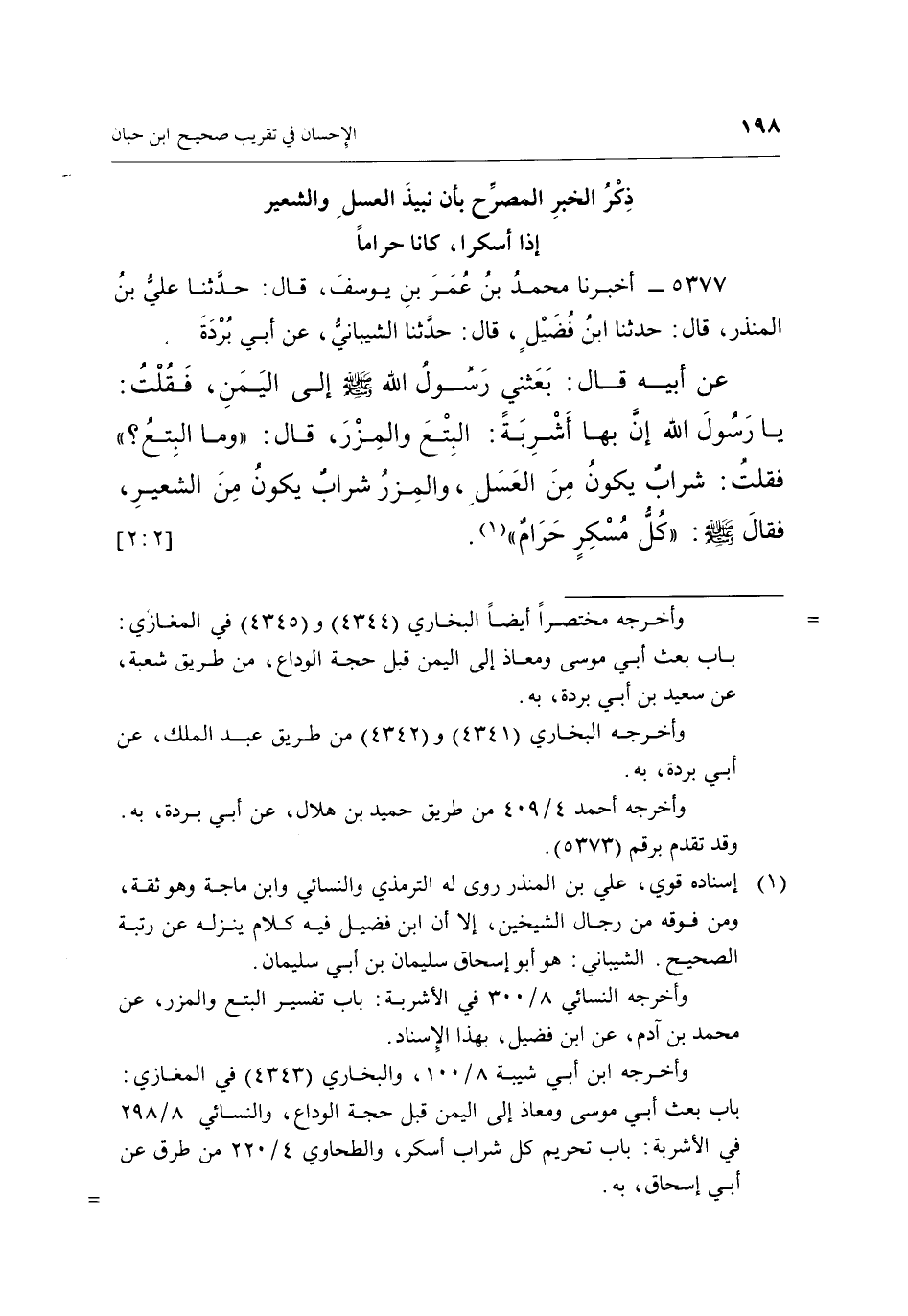 عَنْ أَبِيهِ قَالَ: بَعَثَنِي رَسُولُ اللَّهِ صَلَّى اللَّهُ عَلَيْهِ وَسَلَّمَ إِلَى الْيَمَنِ, فَقُلْتُ: يَا رَسُولَ اللَّهِ إِنَّ بِهَا أَشْرِبَةَ: الْبِتْعِ وَالْمِزْرِ, قَالَ: "وَمَا الْبِتْعُ؟ " فَقُلْتُ: شَرَابٌ يَكُونُ مِنَ الْعَسَلِ, وَالْمِزْرُ شَرَابٌ يَكُونُ مِنَ الشَّعِيرِ, فَقَالَ صَلَّى اللَّهُ عَلَيْهِ وسلم:"كل مسكر حرام"1. [2:2]