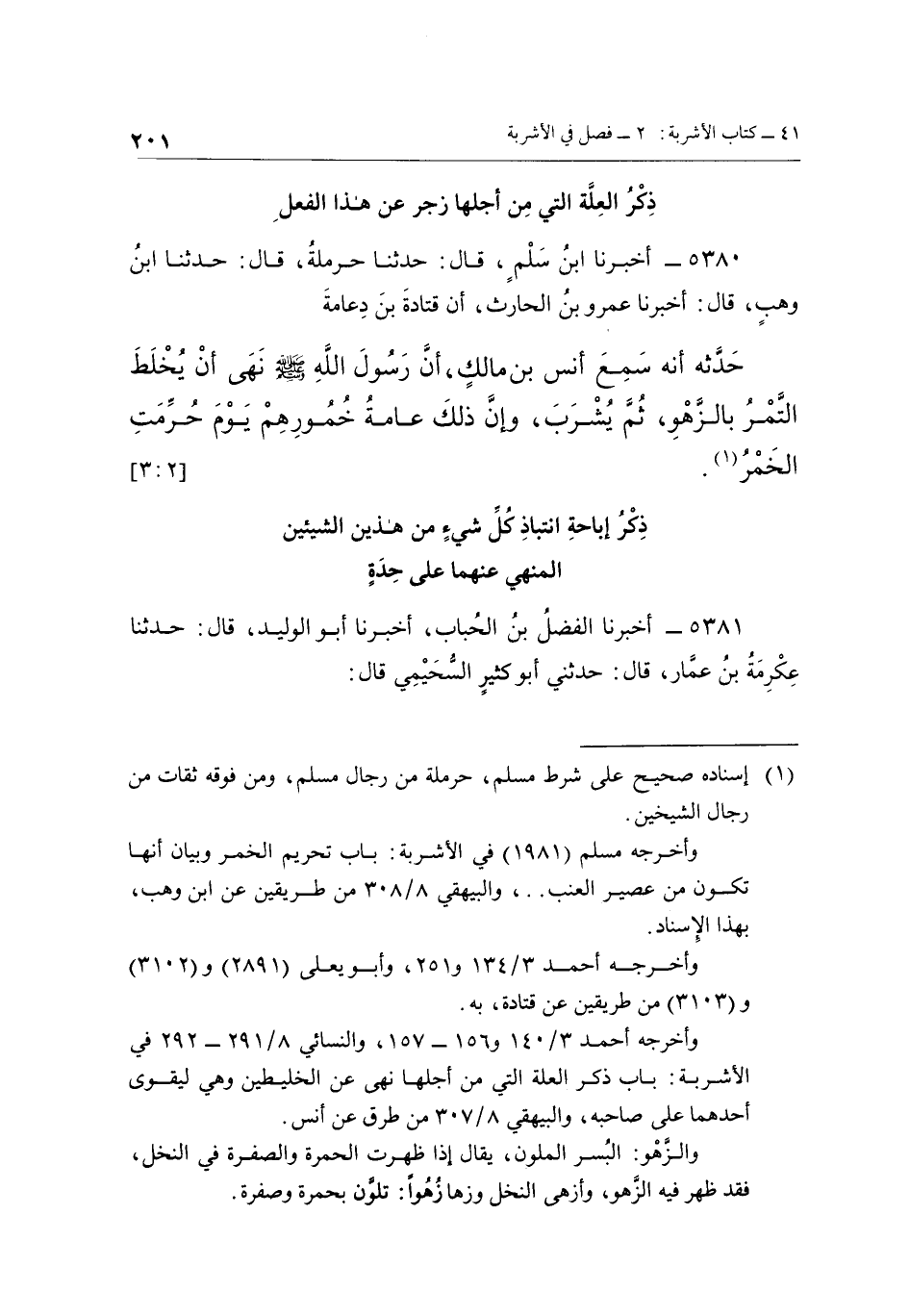 حَدَّثَهُ أَنَّهُ سَمِعَ أَنَسِ بْنِ مَالِكٍ, أَنَّ رَسُولَ اللَّهِ صَلَّى اللَّهُ عَلَيْهِ وَسَلَّمَ نَهَى أن يخلط التمر بالزهور, ثُمَّ يُشْرَبَ, وَإِنَّ ذَلِكَ عَامَّةُ خُمُورِهِمْ يَوْمَ حرمت الخمر1. [3:2]