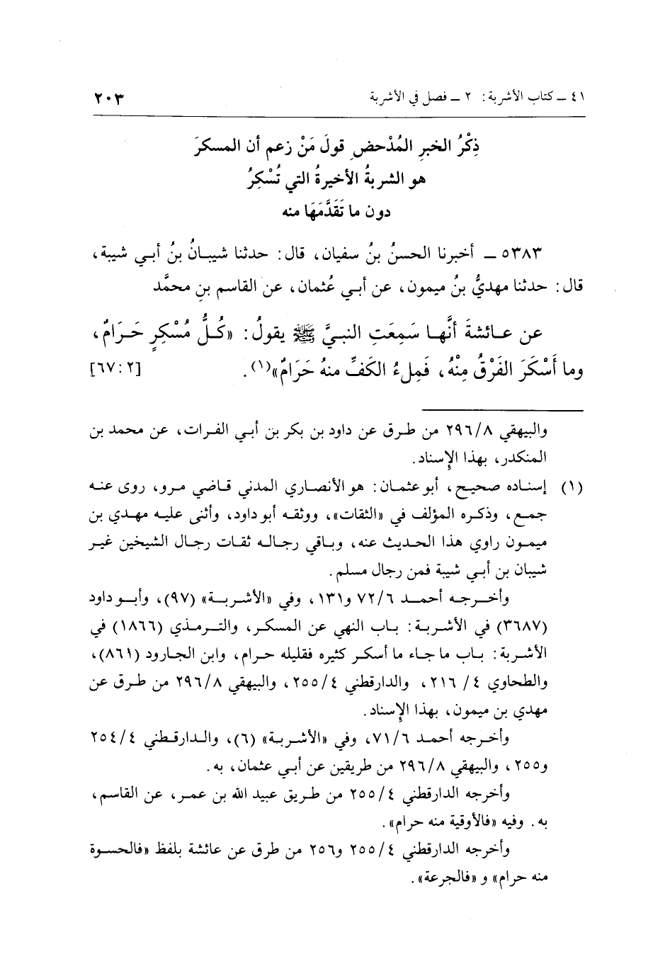 وأخرجه أحمد 6/72و131, وفي"الأشربة"97, وأبو داود3687 في الأشربة: باب النهي عن المسكر, والترمذي1866 في الأشربة: باب ما جاء ما أسكر كثيره فقليله حرام, وابن الجارود861, والطحاوي 4/216, والدارقطني 4/255, والبيهقي 8/269 من طرق عن مهدي بن ميمون, بهذا الإسناد.