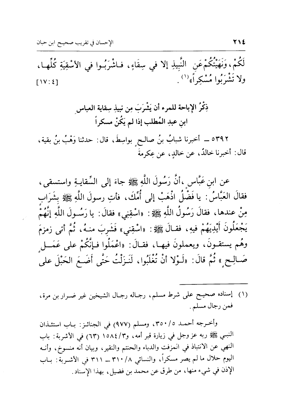 عَنِ ابْنِ عَبَّاسٍ, أَنَّ رَسُولَ اللَّهِ صَلَّى اللَّهُ عَلَيْهِ وَسَلَّمَ جَاءَ إِلَى السِّقَايَةِ وَاسْتَسْقَى, فَقَالَ الْعَبَّاسُ: يَا فَضْلُ اذْهَبْ إِلَى أُمِّكَ, فَأْتِ رَسُولَ اللَّهِ صَلَّى اللَّهُ عَلَيْهِ وَسَلَّمَ بِشَرَابٍ مِنْ عِنْدِهَا, فَقَالَ رَسُولُ اللَّهِ صَلَّى اللَّهُ عَلَيْهِ وَسَلَّمَ: "اسْقِنِي" فَقَالَ: يَا رَسُولَ اللَّهِ إِنَّهُمْ يَجْعَلُونَ أَيْدِيَهُمْ فِيهِ, فَقَالَ صَلَّى اللَّهُ عَلَيْهِ وَسَلَّمَ: "اسْقِنِي" فَشَرِبَ مِنْهُ, ثُمَّ أَتَى زَمْزَمَ وَهُمْ يَسْتَقُونَ, وَيَعْمَلُونَ فِيهَا, فَقَالَ: "اعْمَلُوا فَإِنَّكُمْ عَلَى عَمَلٍ صَالِحٍ" ثُمَّ قَالَ: "لَوْلَا أَنْ تُغْلَبُوا, لَنَزَلْتُ حَتَّى أَضَعَ الْحَبْلَ عَلَى