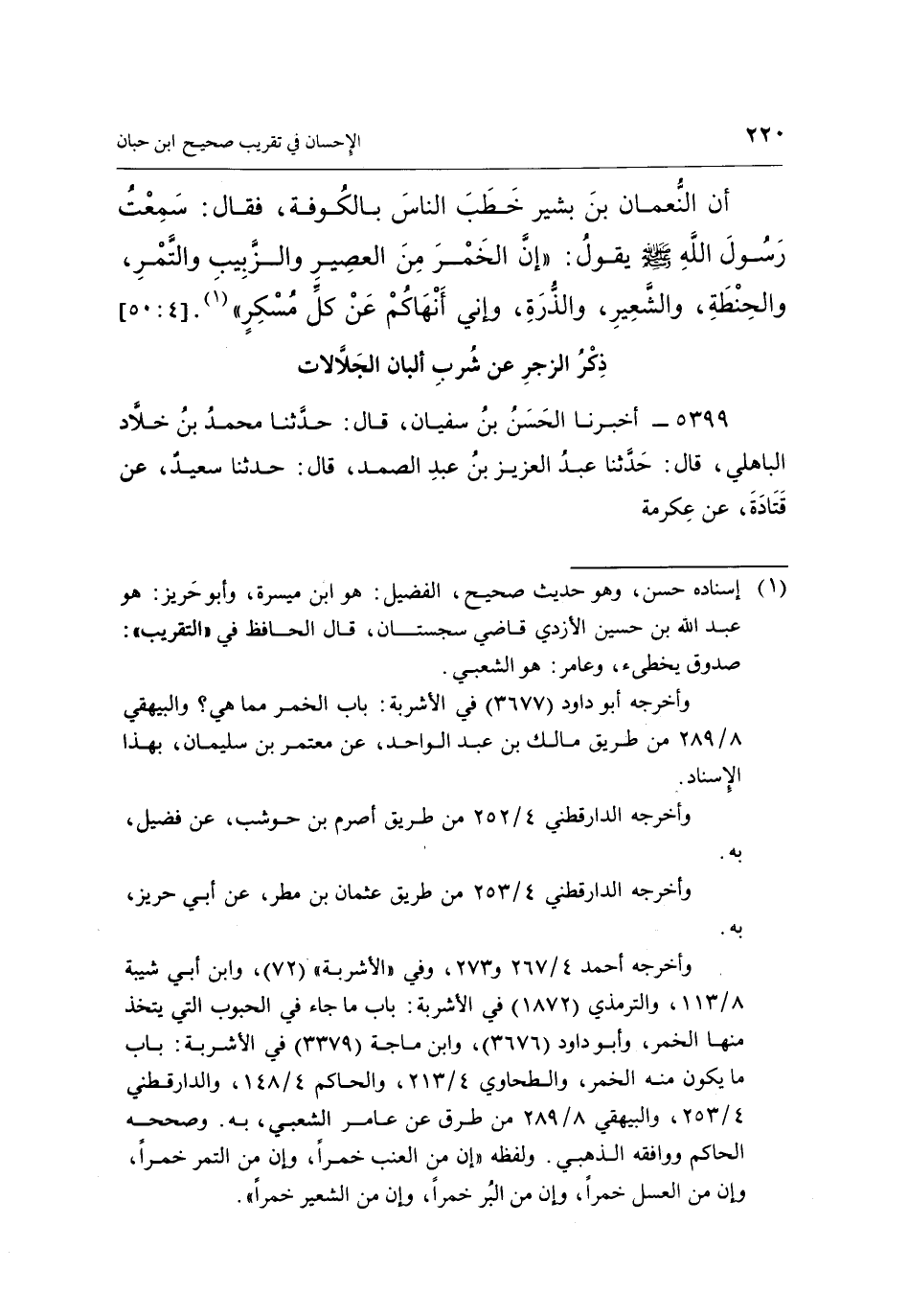 أَنَّ النُّعْمَانَ بْنَ بَشِيرٍ خَطَبَ النَّاسَ بِالْكُوفَةِ, فَقَالَ: سَمِعْتُ رَسُولَ اللَّهِ صَلَّى اللَّهُ عَلَيْهِ وَسَلَّمَ يَقُولُ: "إِنَّ الْخَمْرَ مِنَ الْعَصِيرِ وَالزَّبِيبِ وَالتَّمْرِ, وَالْحِنْطَةِ, وَالشَّعِيرِ, وَالذُّرَةِ, وَإِنِّي أَنْهَاكُمْ عَنْ كل مسكر" 1.