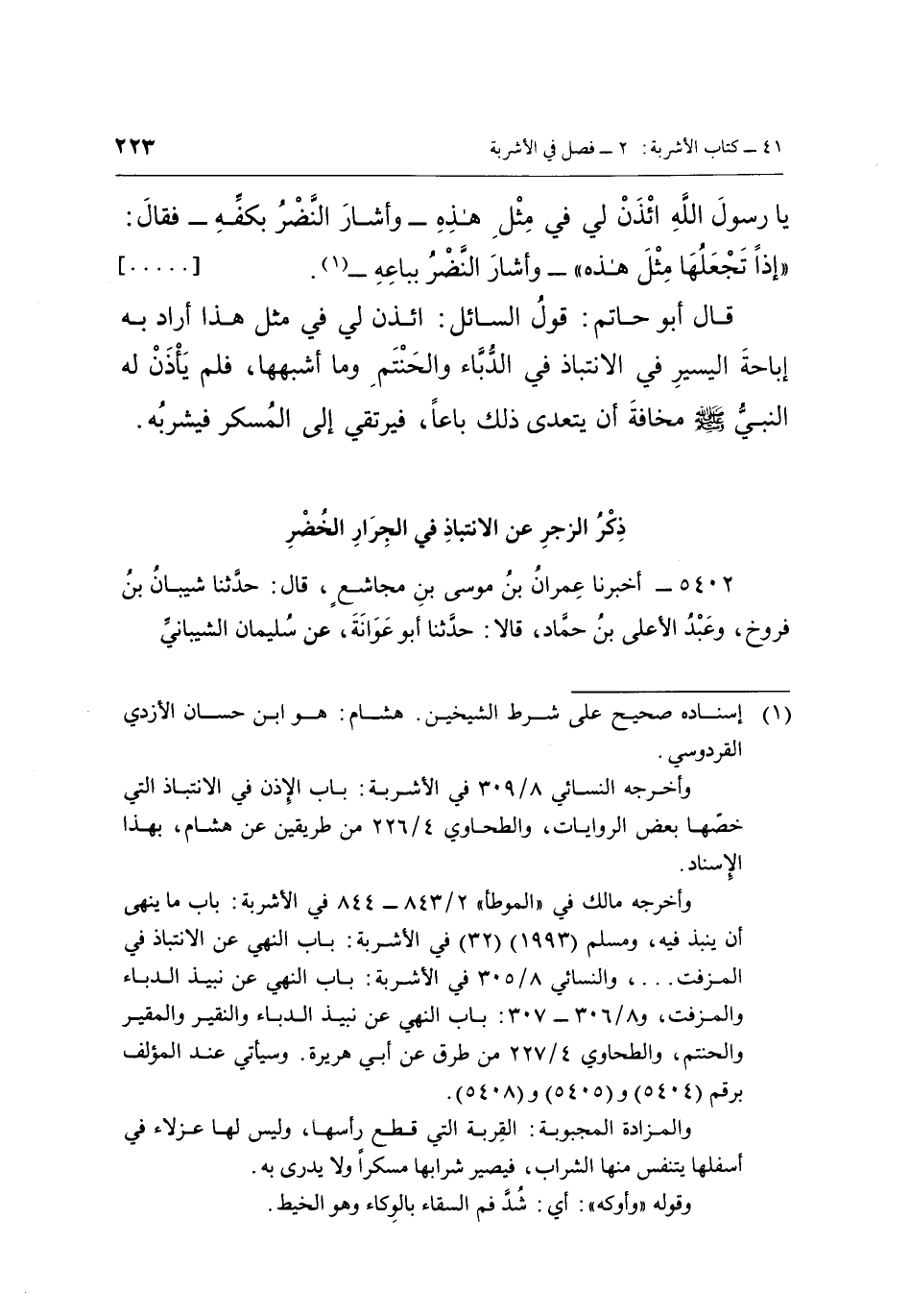 قَالَ أَبُو حَاتِمٍ: قَوْلُ السَّائِلِ: ائْذَنْ لِي فِي مِثْلِ هَذَا أَرَادَ بِهِ إِبَاحَةَ الْيَسِيرِ فِي الِانْتِبَاذِ فِي الدُّبَّاءِ وَالْحَنْتَمِ وَمَا أَشْبَهَهَا, فَلَمْ يَأْذَنْ لَهُ النَّبِيُّ صَلَّى اللَّهُ عَلَيْهِ وَسَلَّمَ مَخَافَةَ أن يتعدي ذلك باعا, فيرتقي على المسكر فيشربه.