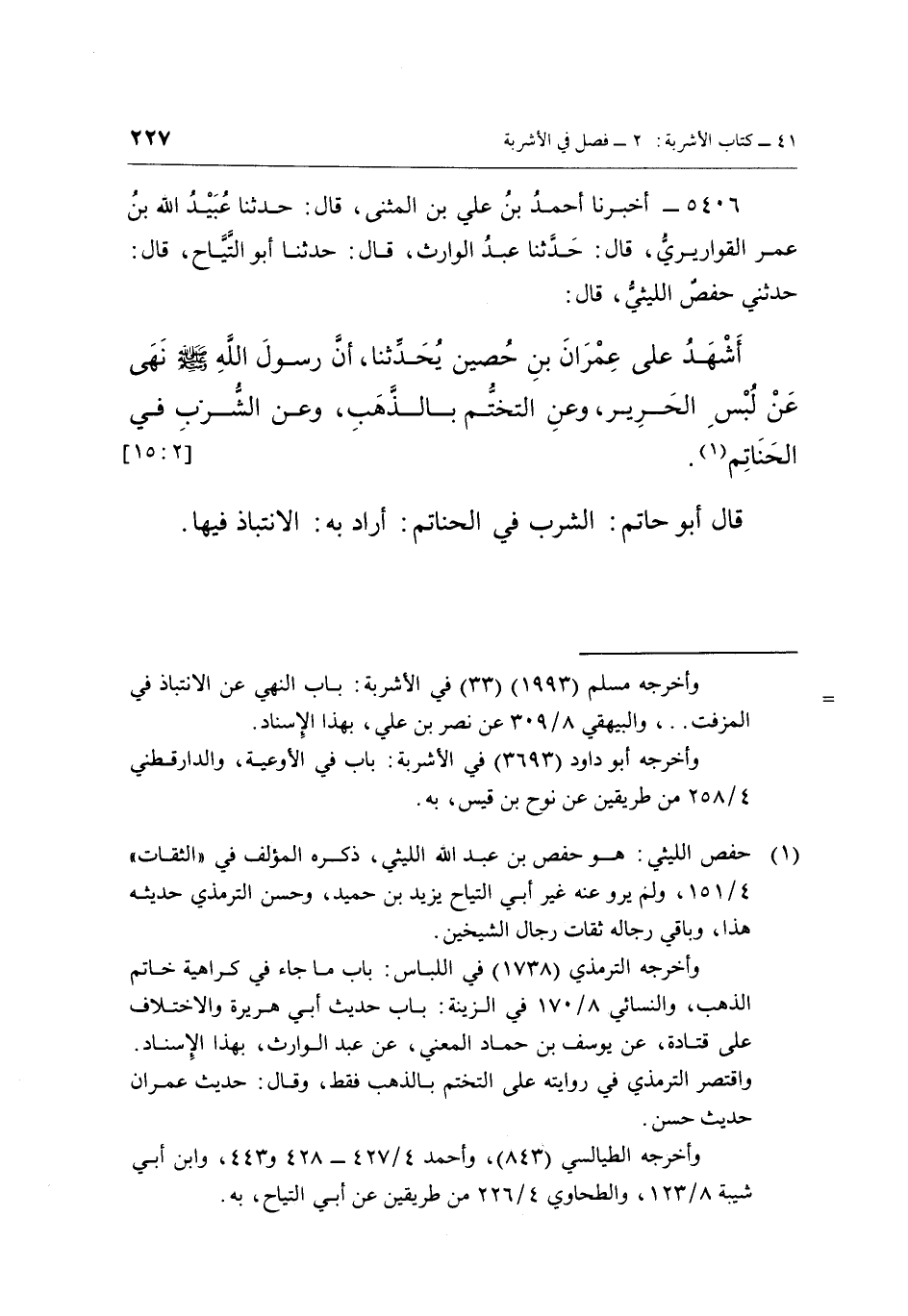 أَشْهَدُ عَلَى عِمْرَانَ بْنِ حُصَيْنٍ يُحَدِّثُنَا, أَنَّ رَسُولَ اللَّهِ صَلَّى اللَّهُ عَلَيْهِ وَسَلَّمَ نَهَى عَنْ لُبْسِ الْحَرِيرِ, وَعَنِ التَّخَتُّمِ بِالذَّهَبِ, وَعَنِ الشُّرْبِ فِي الْحَنَاتِمِ1. [15:2]