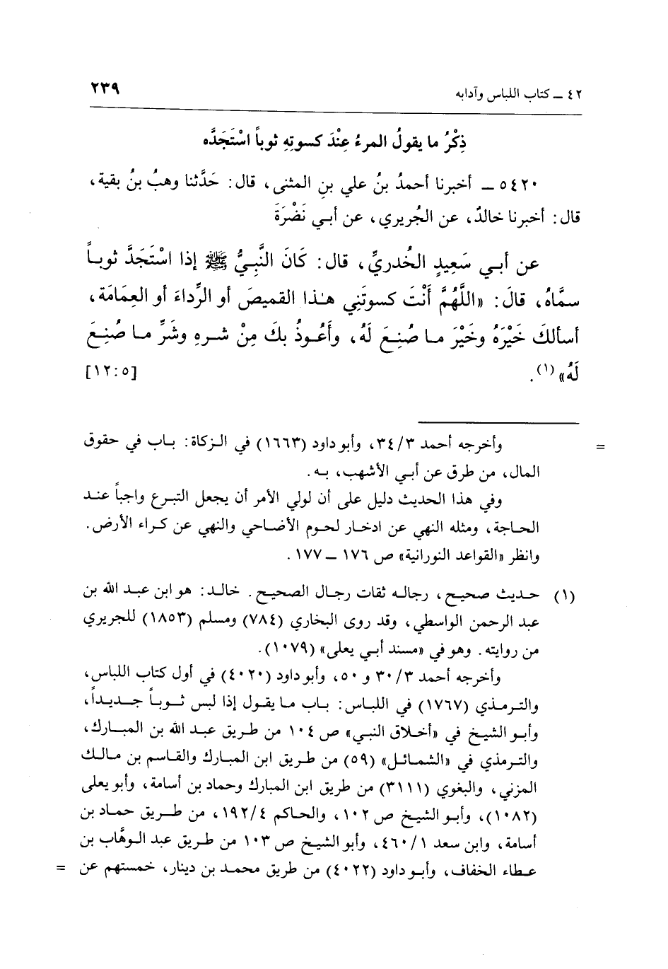عَنْ أَبِي سَعِيدٍ الْخُدْرِيِّ, قَالَ: كَانَ النَّبِيُّ صَلَّى اللَّهُ عَلَيْهِ وَسَلَّمَ إِذَا اسْتَجَدَّ ثَوْبًا سَمَّاهُ قال: "اللهم أنت كسوتني من هَذَا الْقَمِيصَ أَوِ الرِّدَاءَ أَوِ الْعِمَامَةَ, أَسْأَلُكَ خيره وخير ما صنع له, وأعوذ بك من شره وشر ما صنع له"1. [12:5]