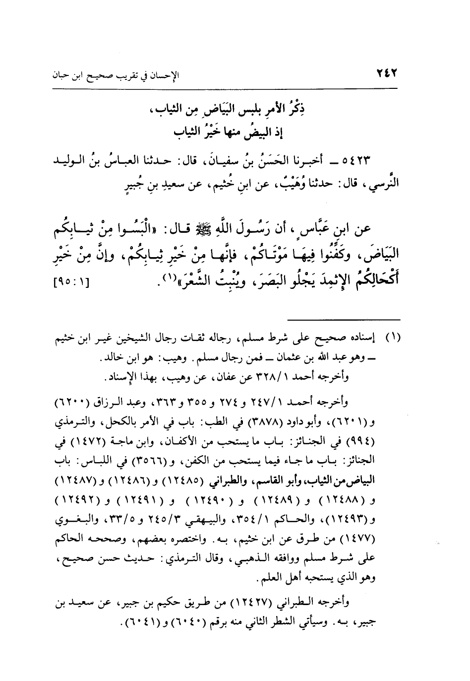 عَنِ ابْنِ عَبَّاسٍ, أَنَّ رَسُولَ اللَّهِ صَلَّى اللَّهُ عَلَيْهِ وسلم قال: "الْبَسُوا مِنْ ثِيَابِكُمُ الْبَيَاضَ, وَكَفِّنُوا فِيهَا مَوْتَاكُمْ, فَإِنَّهَا مِنْ خَيْرِ ثِيَابِكُمْ, وَإِنَّ مِنْ خَيْرِ أكحالكم الإثمد يجلو البصر, وينبت الشعر" 1.