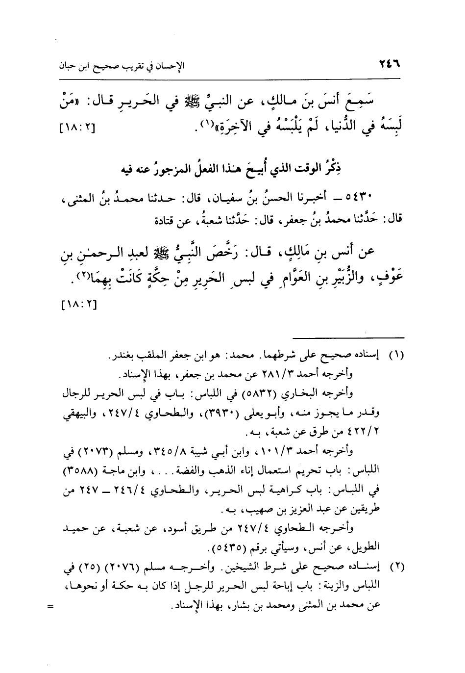 عَنْ أَنَسِ بْنِ مَالِكٍ, قَالَ: رَخَّصَ النَّبِيُّ صَلَّى اللَّهُ عَلَيْهِ وَسَلَّمَ لِعَبْدِ الرَّحْمَنِ بْنِ عَوْفٍ, وَالزُّبَيْرِ بْنِ الْعَوَّامِ فِي لُبْسِ الْحَرِيرِ من حكة كانت بهما 2. [18:2]