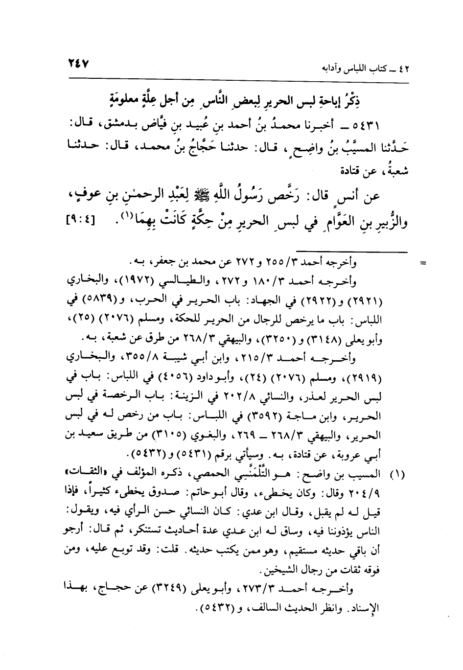 عَنْ أَنَسِ قَالَ: رَخَّصَ رَسُولُ اللَّهِ صَلَّى اللَّهُ عَلَيْهِ وَسَلَّمَ لِعَبْدِ الرَّحْمَنِ بْنِ عَوْفٍ, وَالزُّبَيْرِ بْنِ الْعَوَّامِ فِي لُبْسِ الْحَرِيرِ من حكة كانت بهما 1. [9:4]