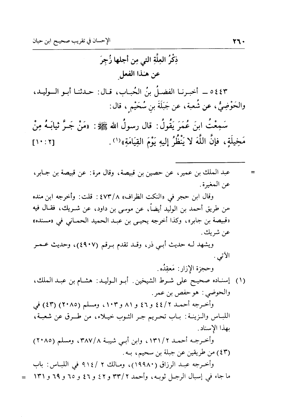 سَمِعْتُ ابْنَ عُمَرَ يَقُولُ: قَالَ رَسُولُ اللَّهِ صَلَّى اللَّهُ عَلَيْهِ وَسَلَّمَ: "مَنْ جَرَّ ثِيَابَهُ مِنْ مَخِيلَةٍ فَإِنَّ الله لا ينظر إليه يوم القيامة" 1. [10:2]