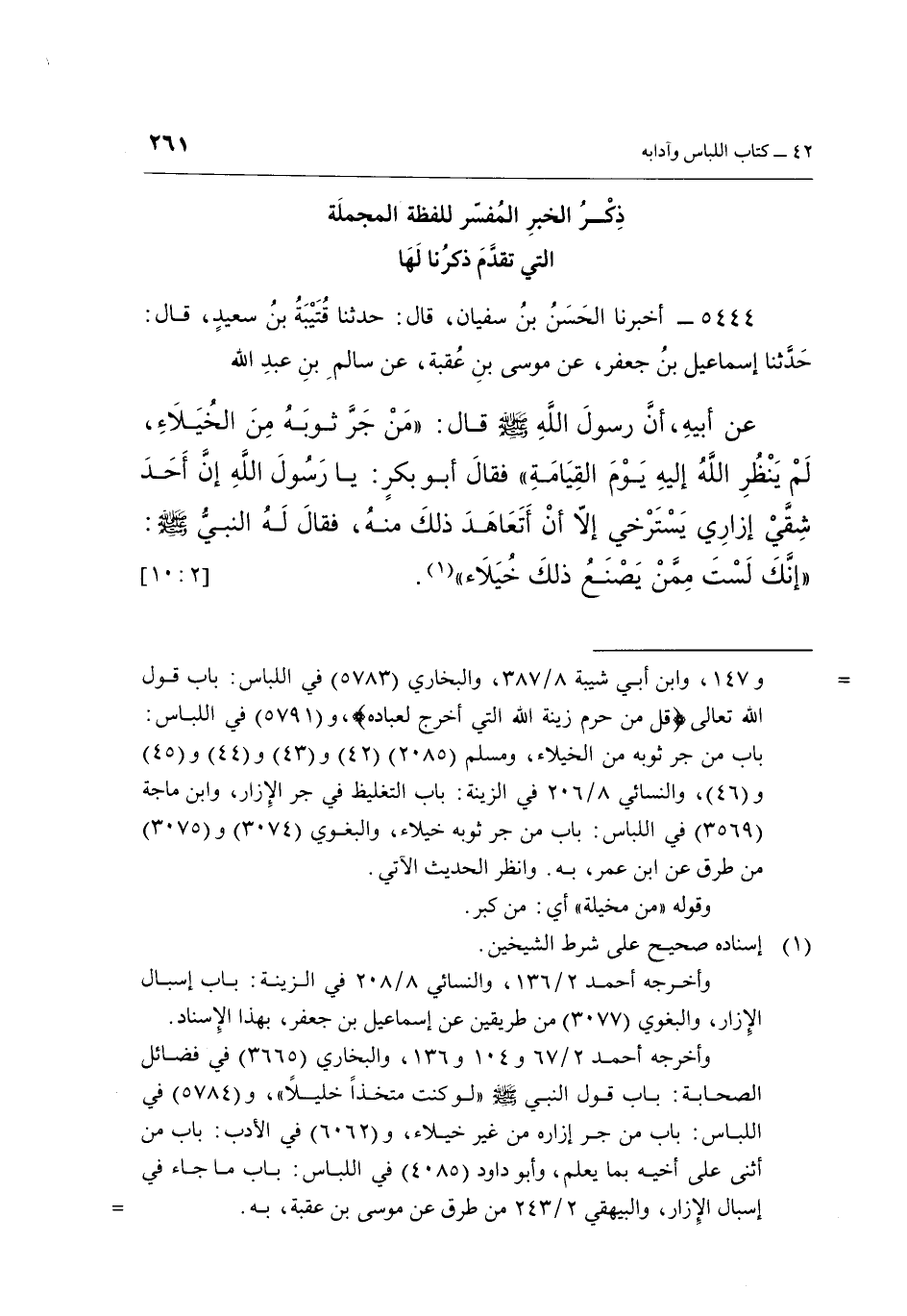 وأخرجه أحمد 2/67و104و136, والبخاري3665 في فضائل الصحابة: باب قول النبي صلى الله عليه وسلم "لو كنت متخذا خليلا" , و5784 في اللباس: باب من جر إزاره من غير خيلاء, و6062 في الأدب: باب منأثنى على أخيه بما يعلم, وأبو داود4085 في اللباس: باب ما جاء في إسبال الإزار, والبيهقي 2/243 من طرق عن موسى بن عقبة, به. =
