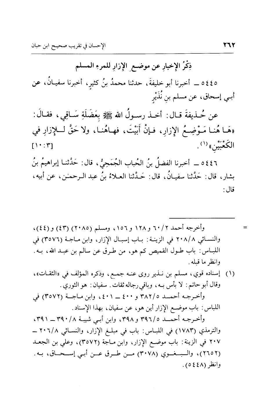 عَنْ حُذَيْفَةَ قَالَ: أَخَذَ رَسُولُ اللَّهِ صَلَّى اللَّهُ عَلَيْهِ وَسَلَّمَ بِعَضَلَةِ سَاقِي, فقال: "ها هنا موضع الإزار, فأن أبيت, فها هنا, ولاحق للإزار في الكعبين" 1. [10:3]