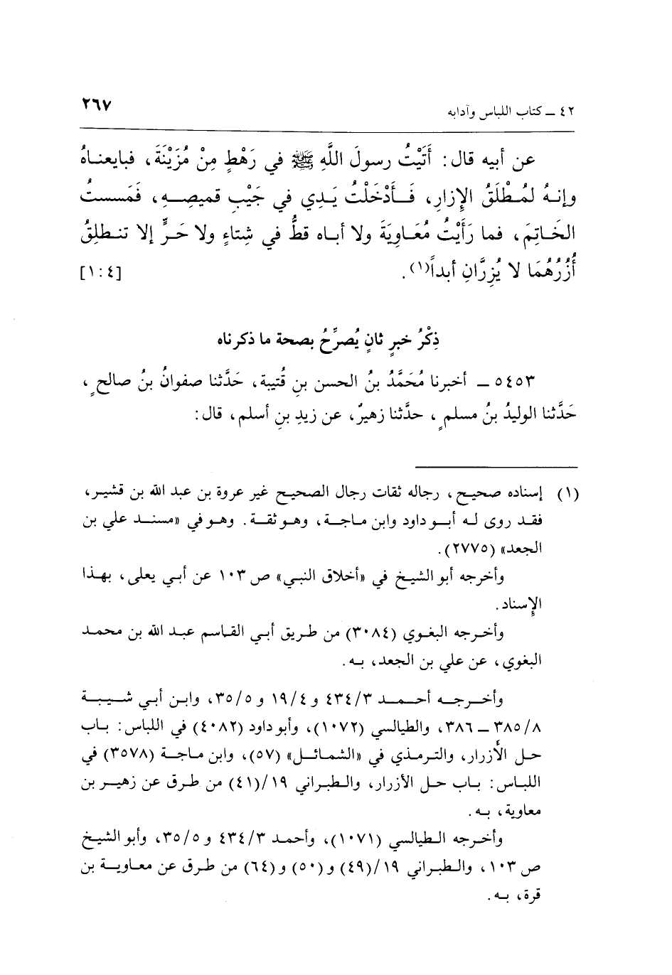 عَنْ أَبِيهِ، قَالَ: أَتَيْتُ رَسُولَ اللَّهِ صَلَّى اللَّهُ عَلَيْهِ وَسَلَّمَ فِي رَهْطٍ مِنْ مُزَيْنَةَ، فَبَايَعْنَاهُ وَإِنَّهُ لَمُطْلَقُ الْأَزْرَارِ، فَأَدْخَلْتُ يَدِي فِي جَيْبِ قَمِيصِهِ، فَمَسَسْتُ الْخَاتَمَ، فَمَا رَأَيْتُ مُعَاوِيَةَ وَلَا أَبَاهُ قَطُّ فِي شِتَاءٍ وَلَا حَرٍّ إِلَّا تَنْطَلِقُ أُزُرُهُمَا لَا يُزِرَّانِ أَبَدًا (¬1) . [4: 1]