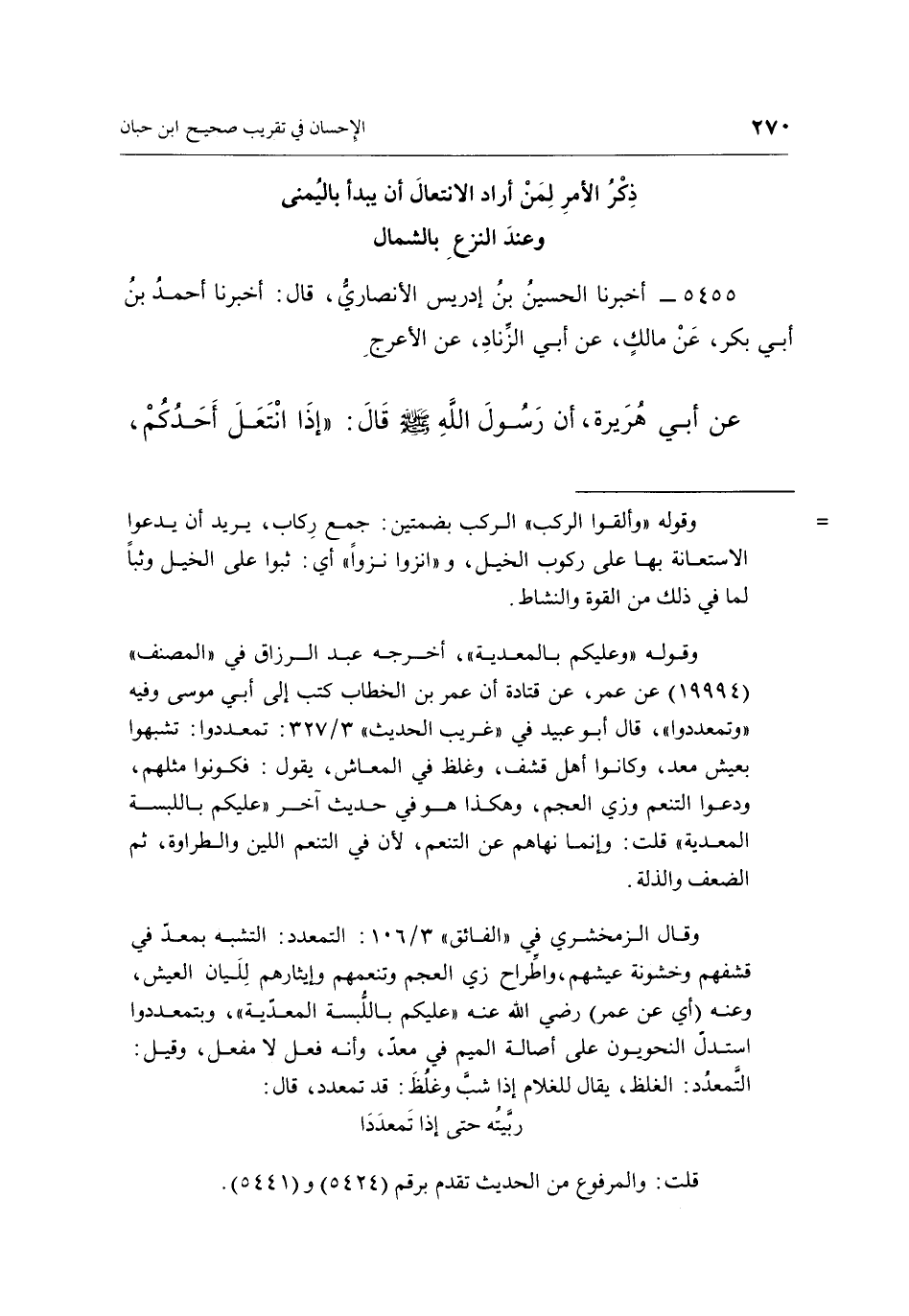 5455 - أَخْبَرَنَا الْحُسَيْنُ بْنُ إِدْرِيسَ الْأَنْصَارِيُّ، قَالَ: أَخْبَرَنَا أَحْمَدُ بْنُ أَبِي بَكْرٍ، عَنْ مَالِكٍ، عَنْ أَبِي الزِّنَادِ، عَنِ الْأَعْرَجِ عَنْ أَبِي هُرَيْرَةَ، أَنَّ رَسُولَ اللَّهِ صَلَّى اللَّهُ عَلَيْهِ وَسَلَّمَ قَالَ: «إِذَا انْتَعَلَ أَحَدُكُمْ،