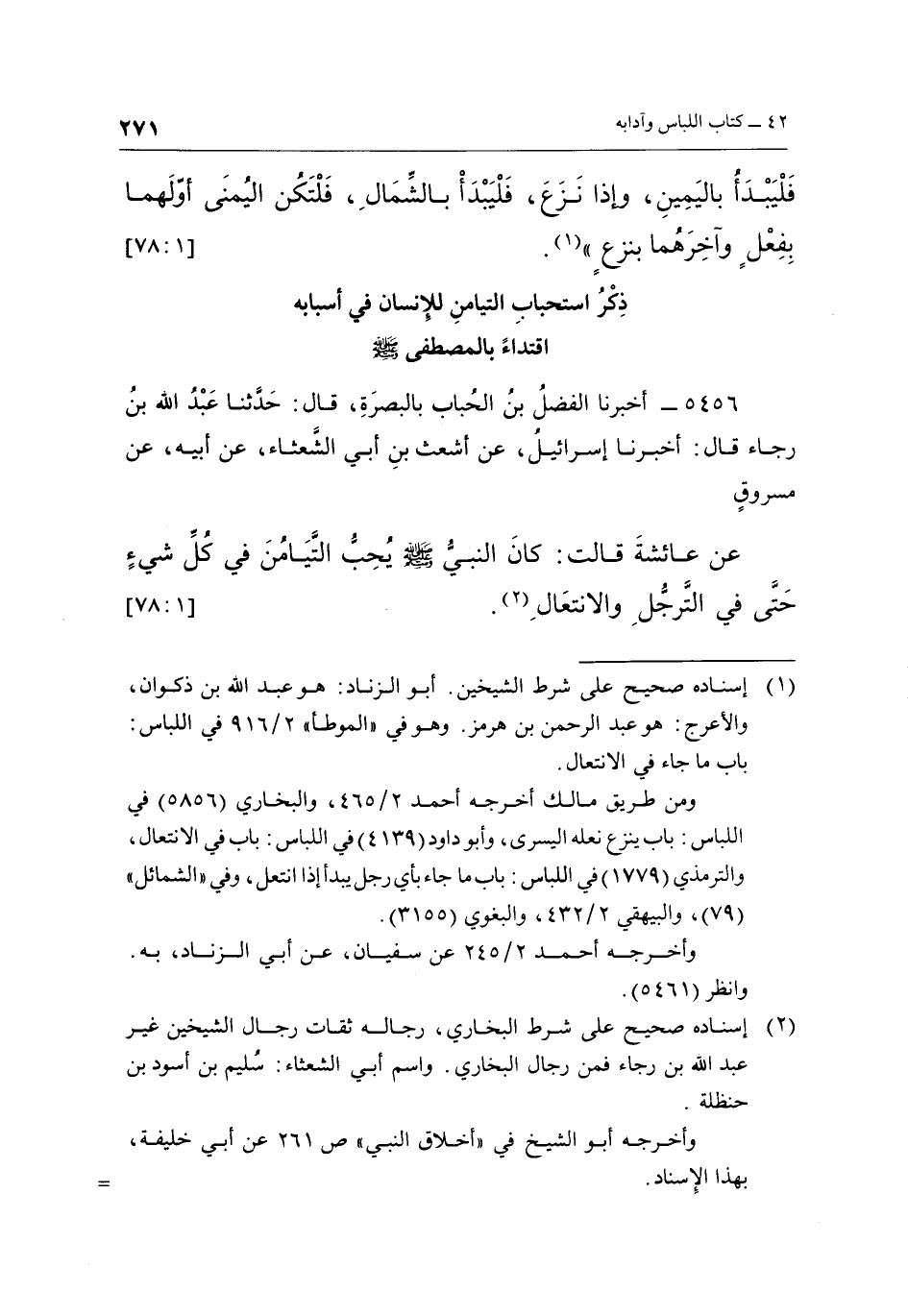 5456 - أَخْبَرَنَا الْفَضْلُ بْنُ الْحُبَابِ بِالْبَصْرَةِ، قَالَ: حَدَّثَنَا عَبْدُ اللَّهِ بْنُ رَجَاءٍ، قَالَ: أَخْبَرَنَا إِسْرَائِيلُ، عَنْ أَشْعَثَ بْنِ أَبِي الشَّعْثَاءِ، عَنْ أَبِيهِ، عَنْ مَسْرُوقٍ عَنْ عَائِشَةَ، قَالَتْ: كَانَ النَّبِيُّ صَلَّى اللَّهُ عَلَيْهِ وَسَلَّمَ يُحِبُّ التَّيَامُنَ فِي كُلِّ شَيْءٍ حَتَّى فِي التَّرَجُّلِ وَالِانْتِعَالِ (¬2) . [1: 78]