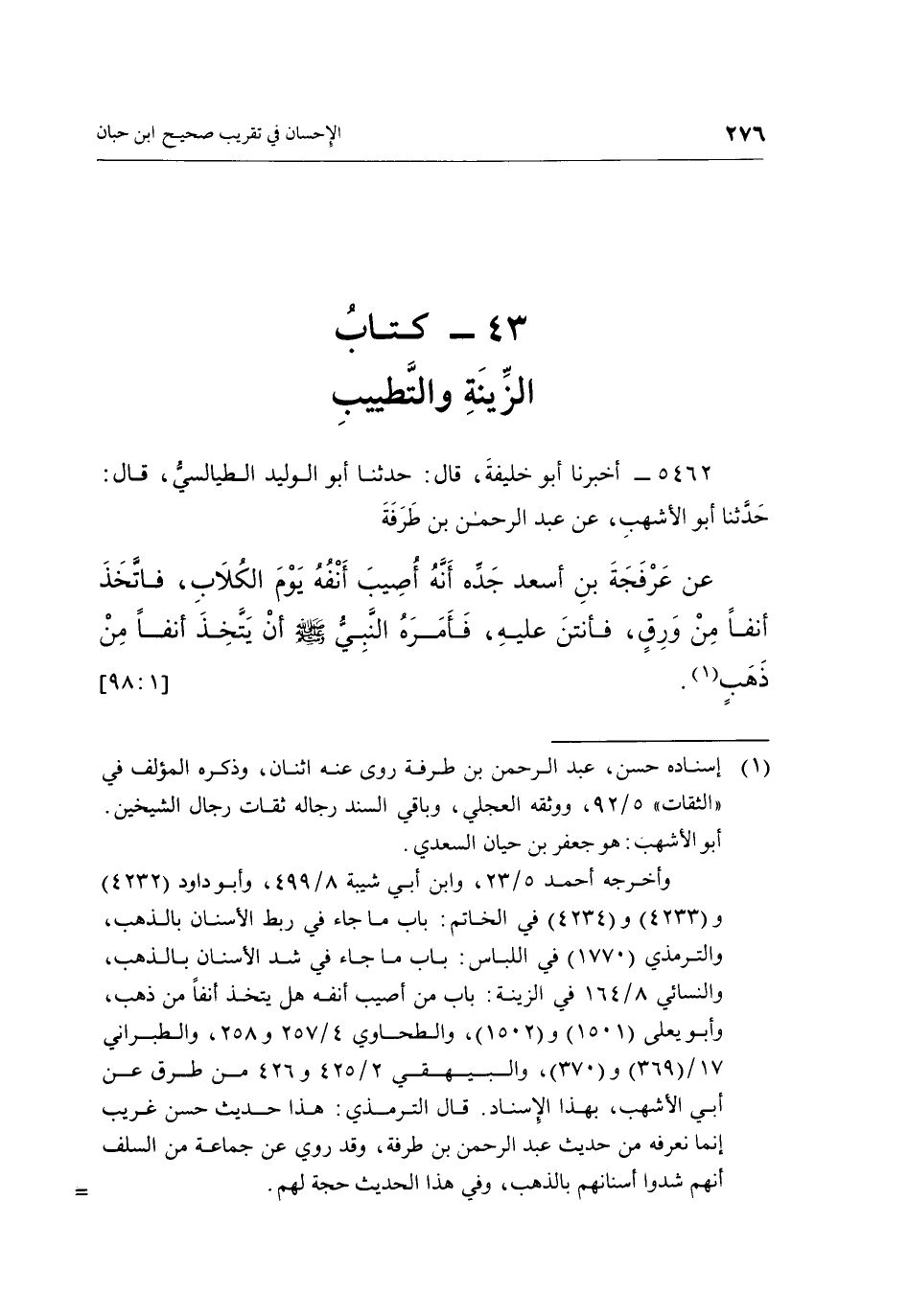 وأخرجه أحمد 5/23، وابن أبي شيبة 8/499، وأبو داود (4232) و (4233) و (4234) في الخاتم: باب ما جاء في ربط الأسنان بالذهب والترمذي (1770) في اللباس: باب ما جاء في شد الأسنان بالذهب والنسائي 8/164 في الزينة: باب من أصيب أنفه هل يتخذ أنفاً من ذهب، وأبو يعلى (1501) و (1502) ، والطحاوي 4/257 و258، والطبراني 17/ (369) و (370) ، والبيهقي 2/425 و426 من طرق عن أبي الأشهب، بهذا الإسناد. قال الترمذي: هذا حديث حسن غريب إنما نعرفه من حديث عبد الرحمن بن طرفة، وقد روي عن جماعة من السلف أنهم شدوا أسنانهم بالذهب، وفي هذا الحديث حجة لهم. =