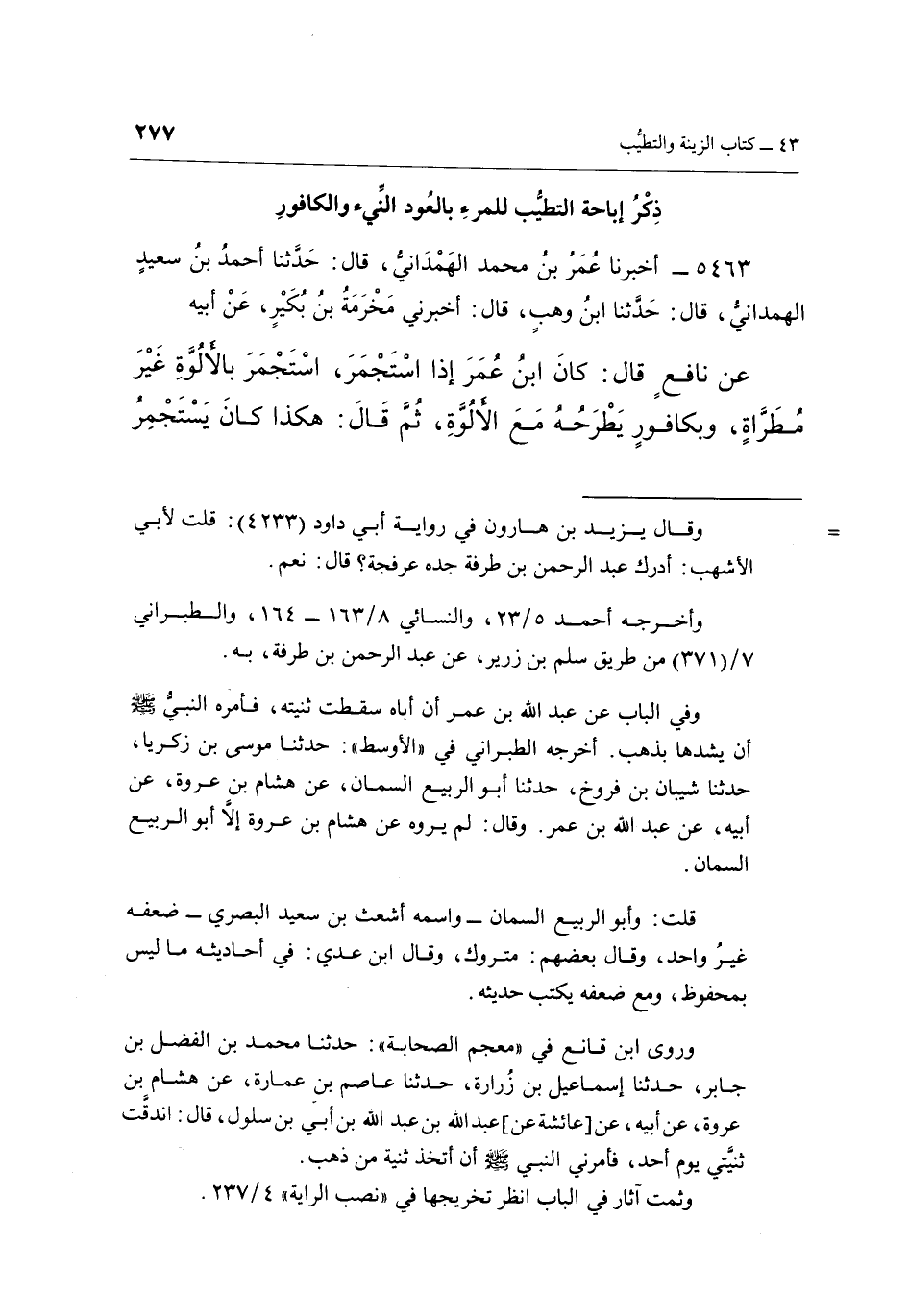 5463 - أَخْبَرَنَا عُمَرُ بْنُ مُحَمَّدٍ الْهَمْدَانِيُّ، قَالَ: حَدَّثَنَا أَحْمَدُ بْنُ سَعِيدٍ الْهَمْدَانِيُّ، قَالَ: حَدَّثَنَا ابْنُ وَهْبٍ، قَالَ: أَخْبَرَنِي مَخْرَمَةُ بْنُ بُكَيْرٍ، عَنْ أَبِيهِ عَنْ نَافِعٍ قَالَ: كَانَ ابْنُ عُمَرَ إِذَا اسْتَجْمَرَ، اسْتَجْمَرَ بِالْأَلُوَّةِ غَيْرَ مُطَرَّاةٍ، وَبِكَافُورٍ يَطْرَحُهُ مَعَ الْأَلُوَّةِ، ثُمَّ قَالَ: هَكَذَا كَانَ يَسْتَجْمِرُ