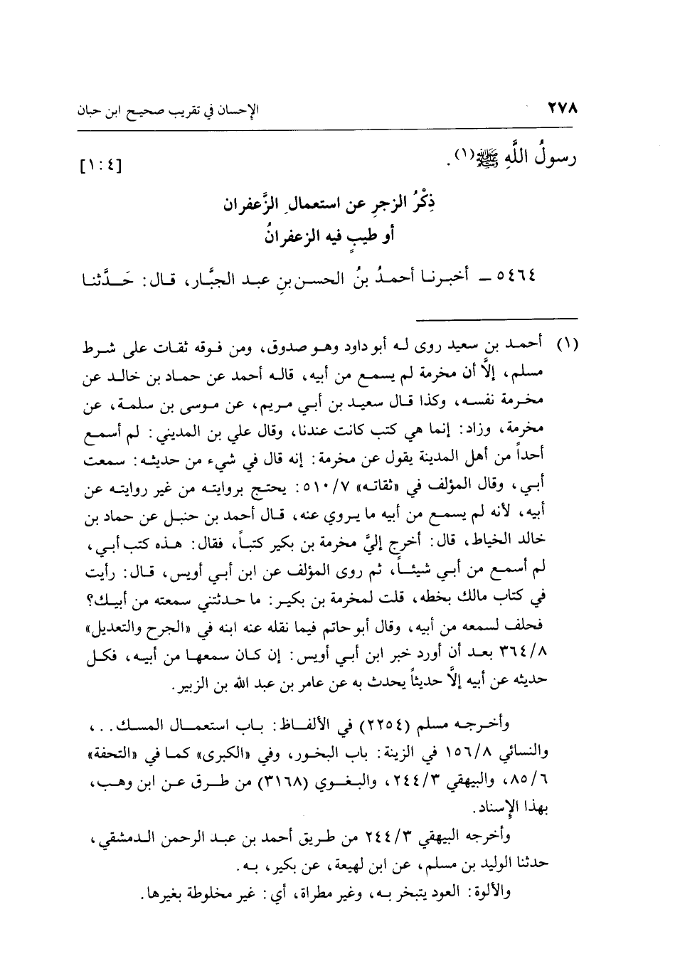 (¬1) أحمد بن سعيد روى له أبو داود وهو صدوق ومن فوقه ثقات على شرط مسلم، إلا أن مخرمة لم يسمع من أبيه، قاله أحمد عن حماد بن خالد عن مخرمة نفسه، وكذا قال سعيد بن أبي مريم، عن موسي بن سلمة، عن مخرمة، وزاد: إنما هي كتب كانت عندنا، وقال علي بن المديني: لم أسمع أحداً من أهل المدينة يقول عن مخرمة: إنه قال في شيء من حديثه: سمعت أبي، وقال المؤلف في " ثقاته " 7/510: يحتج بروايته من غير روايته عن أبيه، لأنه لم يسمع من أبيه ما يروي عنه، قال أحمد بن حنبل عن حماد بن خالد الخياط قال: أخرج إليَّ مخرمة بن بكير كتباً، فقال: هذه كتب أبي، لم أسمع من أبي شيئاً، ثم روى المؤلف عن ابن أبي أويس، قال: رأيت في كتاب مالك بخطه، قلت لمخرمة بن بكير: ما حدثتني سمعته من أبيك؟