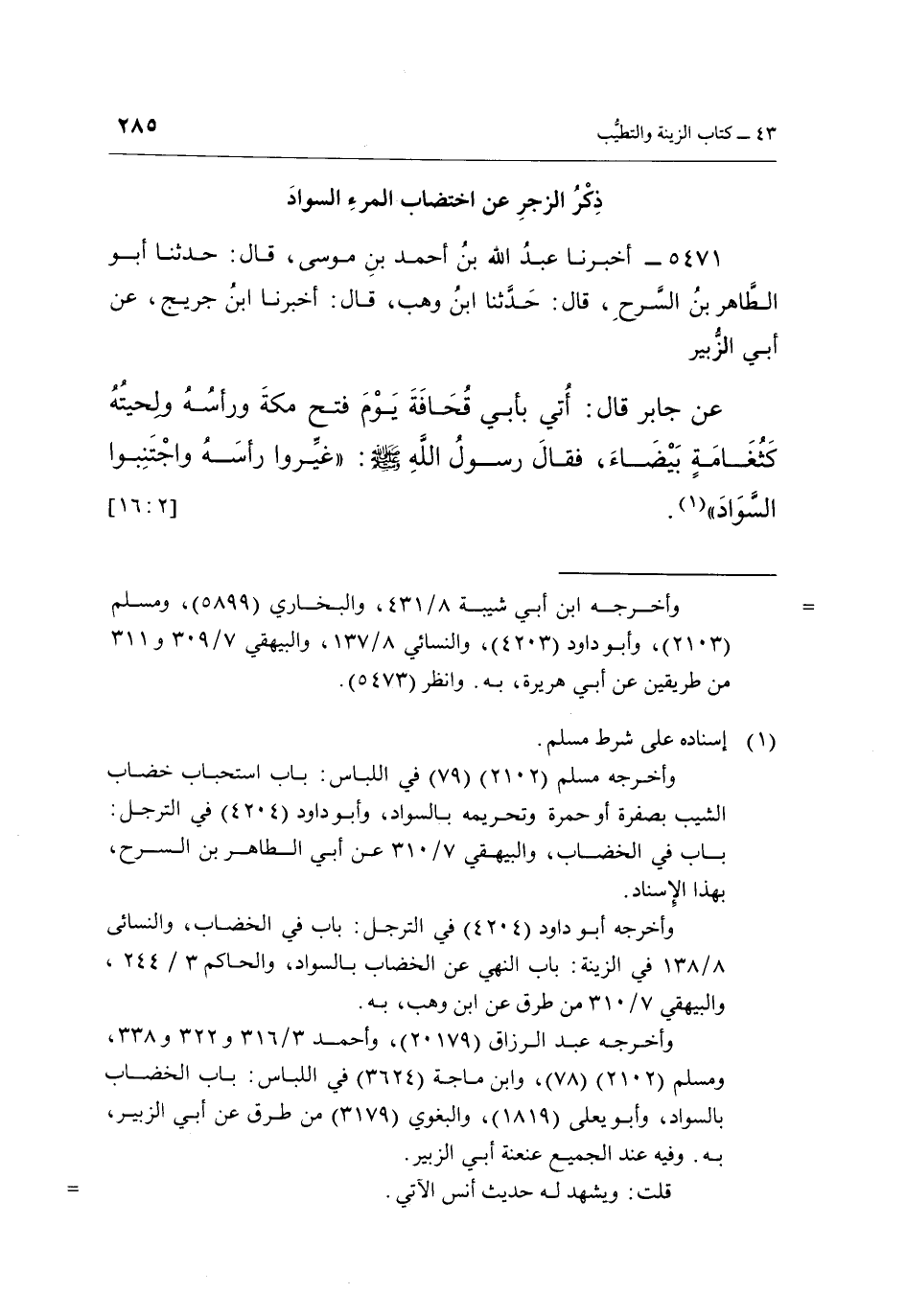 وأخرجه مسلم (2102) (79) في اللباس: باب استحباب خضاب الشيب بصفرة أو حمرة وتحريمه بالسواد، وأبو داود (4204) في الترجل: باب في الخضاب، والبيهقي 7/310 عن أبي الطاهر بن السرح، بهذا الإسناد.