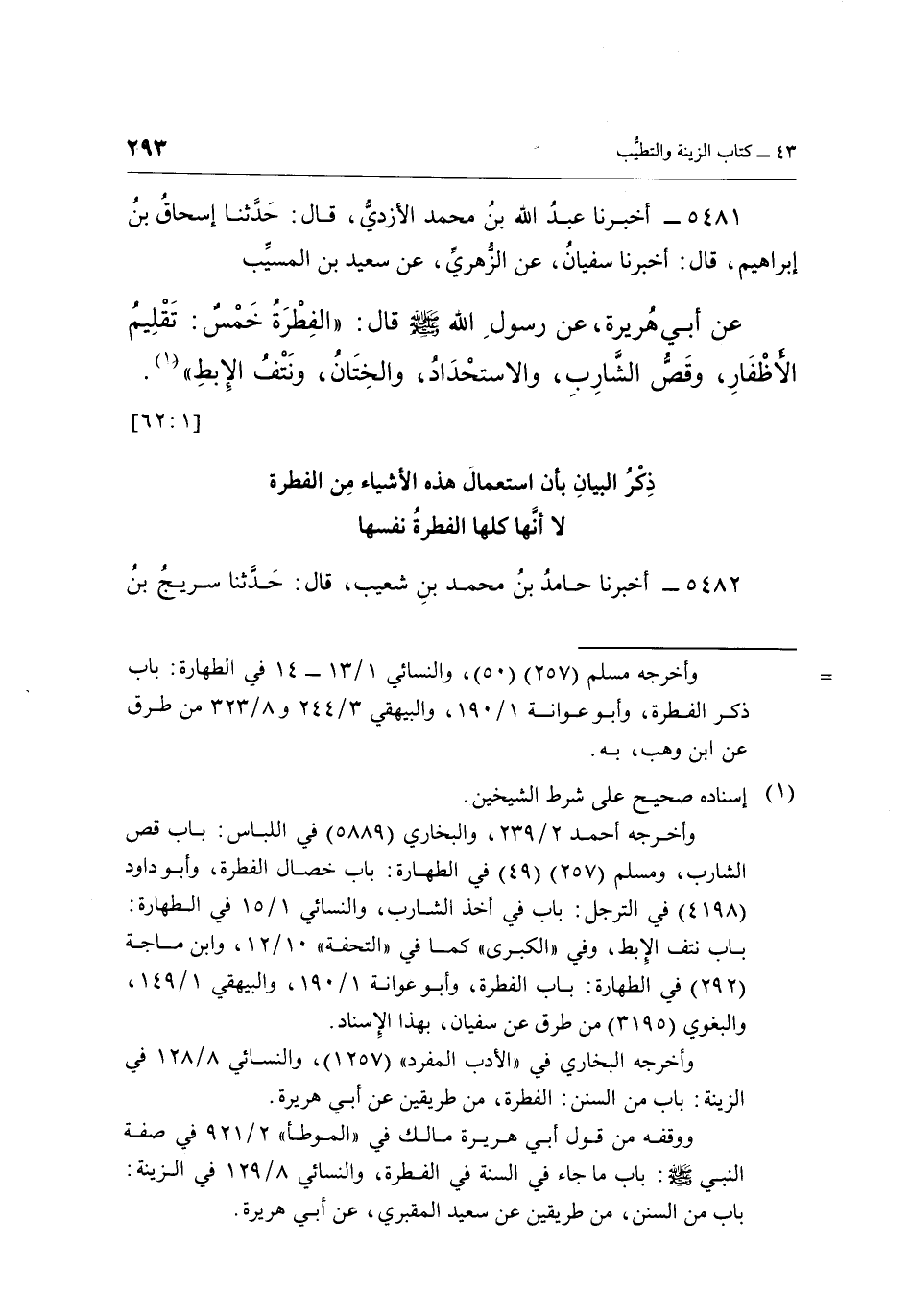 5481 - أَخْبَرَنَا عَبْدُ اللَّهِ بْنُ مُحَمَّدٍ الْأَزْدِيُّ، قَالَ: حَدَّثَنَا إِسْحَاقُ بْنُ إِبْرَاهِيمَ، قَالَ: أَخْبَرَنَا سُفْيَانُ، عَنِ الزُّهْرِيِّ، عَنْ سَعِيدِ بْنِ الْمُسَيِّبِ عَنْ أَبِي هُرَيْرَةَ، عَنْ رَسُولِ اللَّهِ صَلَّى اللَّهُ عَلَيْهِ وَسَلَّمَ قَالَ: «الْفِطْرَةُ خَمْسٌ: تَقْلِيمُ الْأَظَافِرِ، وَقَصُّ الشَّارِبِ، وَالِاسْتِحْدَادُ، وَالْخِتَانُ، وَنَتْفُ الْإِبِطِ» (¬1) . [1: 62]