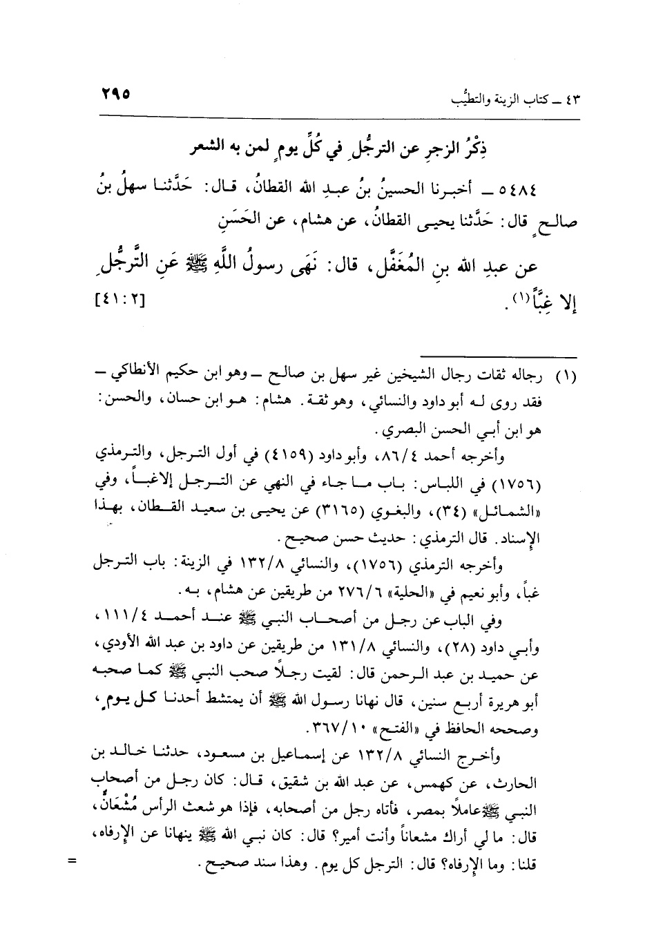وأخرج النسائي 8/132 عن إسماعيل بن مسعود، حدثنا خالد بن الحارث، عن كهمس، عن عبد الله بن شقيق، قال: كان رجل من أصحاب النبي صَلَّى اللهُ عَلَيْهِ وَسَلَّمَ عاملاً بمصر، فأتاه رجل من أصحابه، فإذا هو شعث الرأس مُشْعَان، قال: ما لي أراك مشعانًا وأنت أمير؟ قال: كان نبي الله صَلَّى اللهُ عَلَيْهِ وَسَلَّمَ ينهانا عن الإرفاه، قلنا: وما الإرفاه؟ قال: الترجل كل يوم. وهذا سند صحيح. =