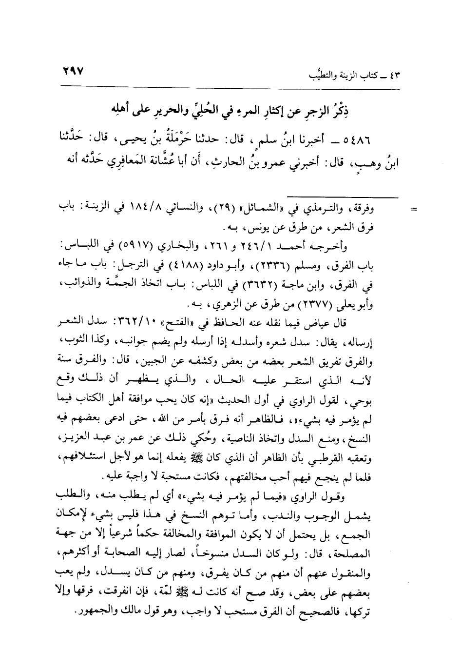وقول الراوي " فيما لم يؤمر فيه بشيء أي لم يطلب منه، والطلب يشمل الوجوب والندب، وأما توهم النسخ في هذا فليس بشيء لإمكان الجمع، بل يحتمل أن لا يكون الموافقة والمخالفة حكمًا شرعيًا إلا من جهة المصلحة، قال: ولو كان السدل منسوخاً، لصار إليه الصحابة أو أكثرهم، والمنقول عنهم أن منهم من كان يفرق، ومنهم من كان يسدل، ولم يعب بعضهم على بعض، وقد صح أنه كانت له صَلَّى اللهُ عَلَيْهِ وَسَلَّمَ لمّة، فإن انفرقت، فرقها وإلا تركها، فالصحيح أن الفرق مستحب لا واجب، وهو قول مالك والجمهور.