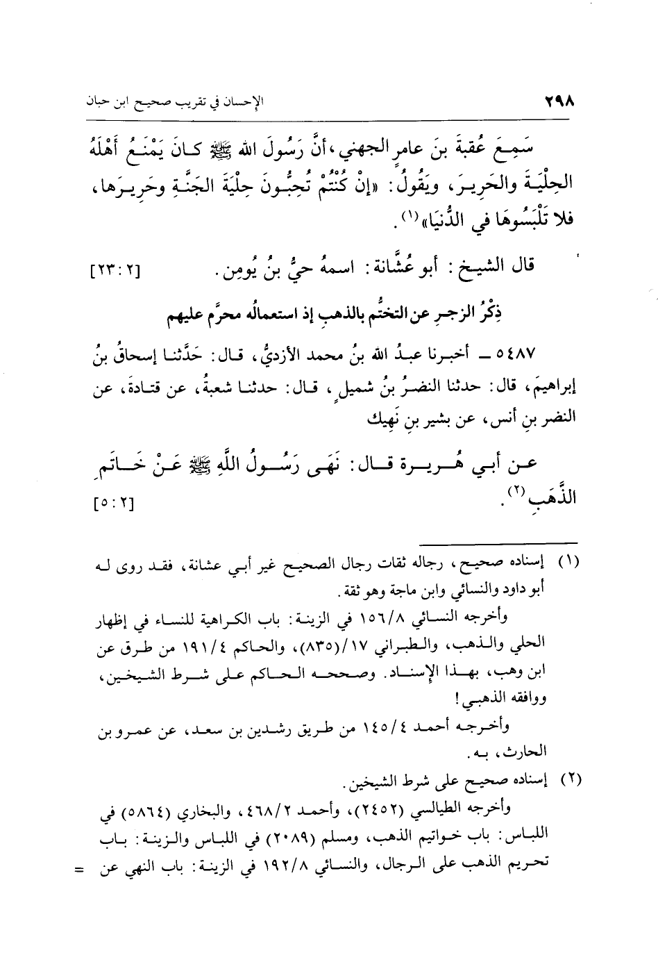 5487 - أَخْبَرَنَا عَبْدُ اللَّهِ بْنُ مُحَمَّدٍ الْأَزْدِيُّ، قَالَ: حَدَّثَنَا إِسْحَاقُ بْنُ إِبْرَاهِيمَ، قَالَ: حَدَّثَنَا النَّضْرُ بْنُ شُمَيْلٍ، قَالَ: حَدَّثَنَا شُعْبَةُ، عَنْ قَتَادَةَ، عَنِ النَّضْرِ بْنِ أَنَسٍ، عَنْ بَشِيرِ بْنِ نَهِيكٍ عَنْ أَبِي هُرَيْرَةَ، قَالَ: نَهَى رَسُولُ اللَّهِ صَلَّى اللَّهُ عَلَيْهِ وَسَلَّمَ عَنْ خَاتَمِ الذَّهَبِ (¬2) . [2: 5]