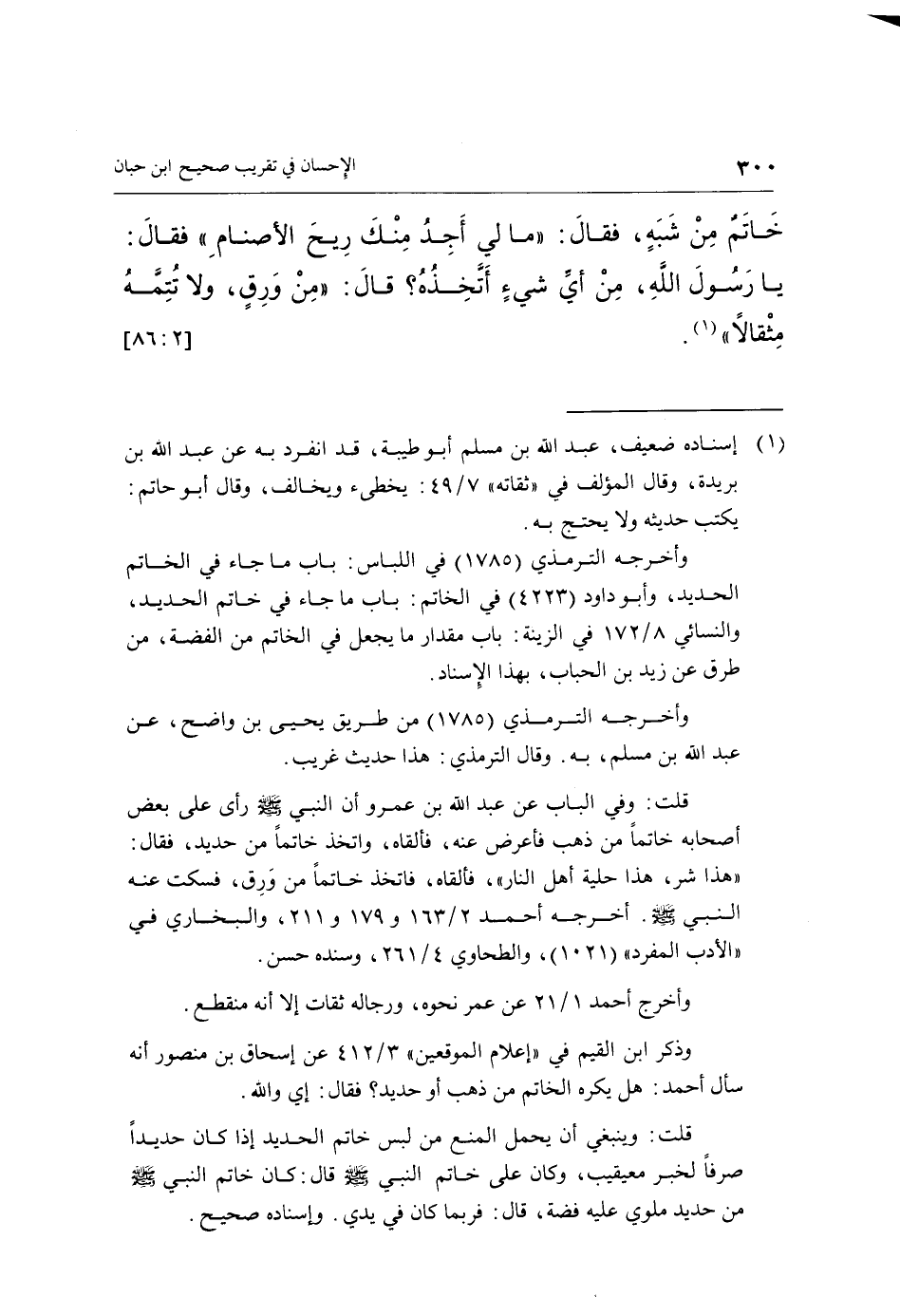 خَاتَمٌ مِنْ شَبَهٍ، فَقَالَ: "مَا لِي أَجِدُ مِنْكَ رِيحَ الْأَصْنَامِ» فَقَالَ: يَا رَسُولَ اللَّهِ، مِنْ أَيِّ شَيْءٍ أَتَّخِذُهُ؟ قَالَ: «مِنْ وَرِقٍ، وَلَا تُتِمَّهُ مِثْقَالًا" (¬1) . [2: 86]
