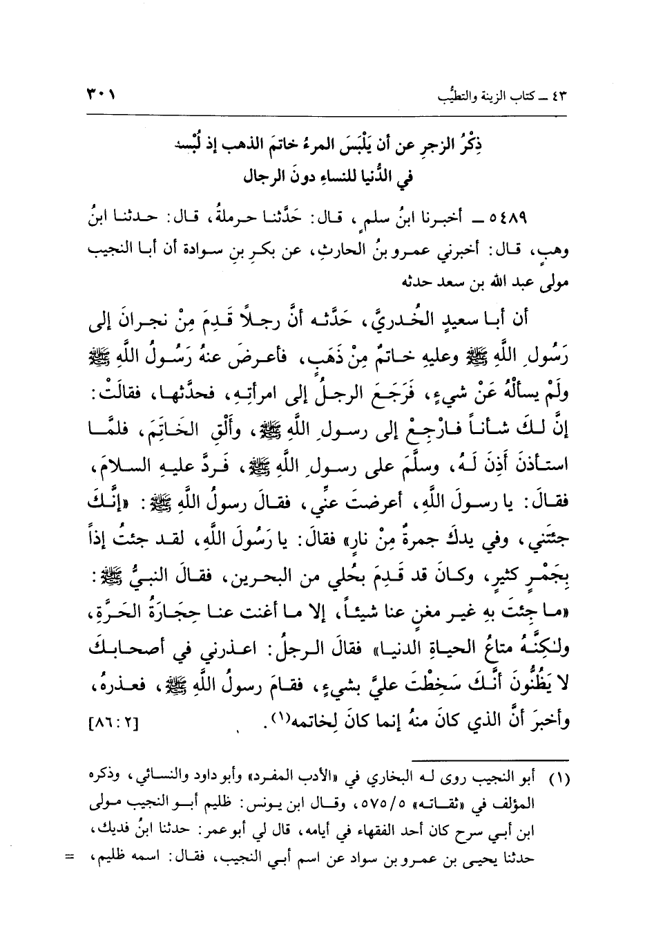 5489 - أَخْبَرَنَا ابْنُ سَلْمٍ، قَالَ: حَدَّثَنَا حَرْمَلَةُ، قَالَ: حَدَّثَنَا ابْنُ وَهْبٍ، قَالَ: أَخْبَرَنِي عَمْرُو بْنُ الْحَارِثِ، عَنْ بَكْرِ بْنِ سَوَادَةَ، أَنَّ أَبَا النَّجِيبِ، مَوْلَى عَبْدِ اللَّهِ بْنِ سَعْدٍ حَدَّثَهُ أَنَّ أَبَا سَعِيدٍ الْخُدْرِيَّ، حَدَّثَهُ أَنَّ رَجُلًا قَدِمَ مِنْ نَجْرَانَ إِلَى رَسُولِ اللَّهِ صَلَّى اللَّهُ عَلَيْهِ وَسَلَّمَ وَعَلَيْهِ خَاتَمٌ مِنْ ذَهَبٍ، فَأَعْرَضَ عَنْهُ رَسُولُ اللَّهِ صَلَّى اللَّهُ عَلَيْهِ وَسَلَّمَ وَلَمْ يَسْأَلْهُ عَنْ شَيْءٍ، فَرَجَعَ الرَّجُلُ إِلَى امْرَأَتِهِ، فَحَدَّثَهَا، فَقَالَتْ: إِنَّ لَكَ شَأْنًا، فَارْجِعْ إِلَى رَسُولِ اللَّهِ صَلَّى اللَّهُ عَلَيْهِ وَسَلَّمَ وَأَلْقِ الْخَاتَمَ، فَلَمَّا اسْتَأْذَنَ أَذِنَ لَهُ، وَسَلَّمَ عَلَى رَسُولِ اللَّهِ صَلَّى اللَّهُ عَلَيْهِ وَسَلَّمَ، فَرَدَّ عَلَيْهِ السَّلَامَ، فَقَالَ: يَا رَسُولَ اللَّهِ أَعْرَضْتَ عَنِّي، فَقَالَ رَسُولُ اللَّهِ صَلَّى اللَّهُ عَلَيْهِ وَسَلَّمَ: «إِنَّكَ جِئْتَنِيَ، وَفِي يَدِكَ جَمْرَةٌ مِنْ نَارٍ» فَقَالَ: يَا رَسُولَ اللَّهِ لَقَدْ جِئْتُ إِذًا بِجَمْرٍ كَثِيرٍ، وَكَانَ قَدْ قَدِمَ بِحُلِيٍّ مِنَ الْبَحْرَيْنِ، فَقَالَ النَّبِيُّ صَلَّى اللَّهُ عَلَيْهِ وَسَلَّمَ: «مَا جِئْتَ بِهِ غَيْرُ مُغْنٍ عَنَّا شَيْئًا، إِلَّا مَا أَغْنَتْ عَنَّا حِجَارَةُ الْحَرَّةِ، وَلَكِنَّهُ مَتَاعُ الْحَيَاةِ الدُّنْيَا» فَقَالَ الرَّجُلُ: اعْذُرْنِي فِي أَصْحَابِكَ لَا يَظُنُّونَ أَنَّكَ سَخِطْتَ عَلَيَّ بِشَيْءٍ، فَقَامَ رَسُولُ اللَّهِ صَلَّى اللَّهُ عَلَيْهِ وَسَلَّمَ فَعَذَرَهُ، وَأَخْبَرَ أَنَّ الَّذِي كَانَ مِنْهُ إِنَّمَا كَانَ لِخَاتَمِهِ (¬1) . [2: 86]