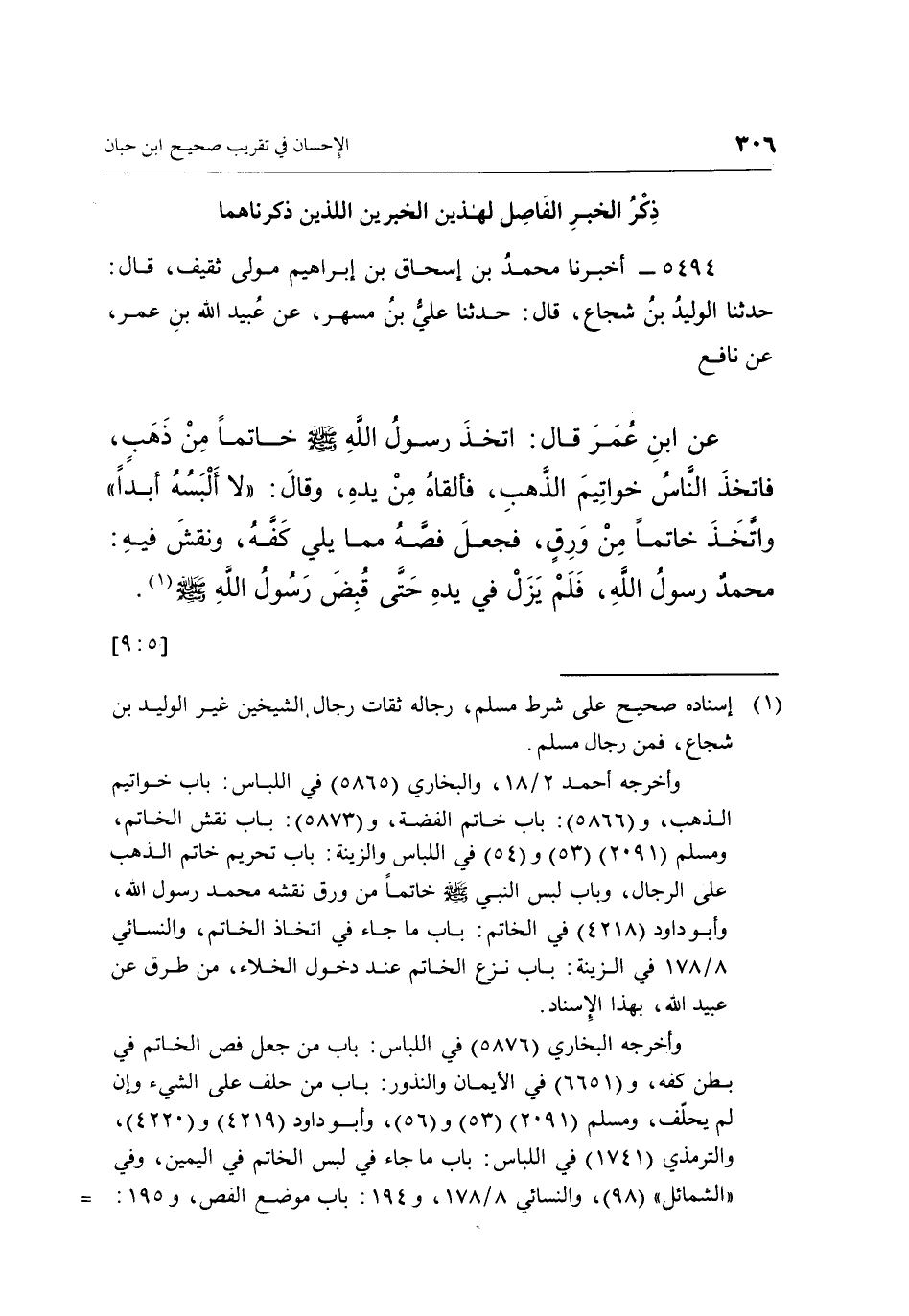 5494 - أَخْبَرَنَا مُحَمَّدُ بْنُ إِسْحَاقَ بْنِ إِبْرَاهِيمَ، مَوْلَى ثَقِيفٍ، قَالَ: حَدَّثَنَا الْوَلِيدُ بْنُ شُجَاعٍ، قَالَ: حَدَّثَنَا عَلِيُّ بْنُ مُسْهِرٍ، عَنْ عُبَيْدِ اللَّهِ بْنِ عُمَرَ، عَنْ نَافِعٍ عَنِ ابْنِ عُمَرَ، قَالَ: اتَّخَذَ رَسُولُ اللَّهِ صَلَّى اللَّهُ عَلَيْهِ وَسَلَّمَ خَاتَمًا مِنْ ذَهَبٍ، فَاتَّخَذَ النَّاسُ خَوَاتِيمَ الذَّهَبِ، فَأَلْقَاهُ مِنْ يَدِهِ، وَقَالَ: «لَا أَلْبَسُهُ أَبَدًا» وَاتَّخَذَ خَاتَمًا مِنْ وَرَقٍ، فَجَعَلَ فَصَّهُ مِمَّا يَلِي كَفَّهُ وَنَقَشَ فِيهِ: مُحَمَّدٌ رَسُولُ اللَّهِ، فَلَمْ يَزَلْ فِي يَدِهِ حَتَّى قُبِضَ رَسُولُ اللَّهِ صَلَّى اللَّهُ عَلَيْهِ وَسَلَّمَ (¬1) . [5: 9]