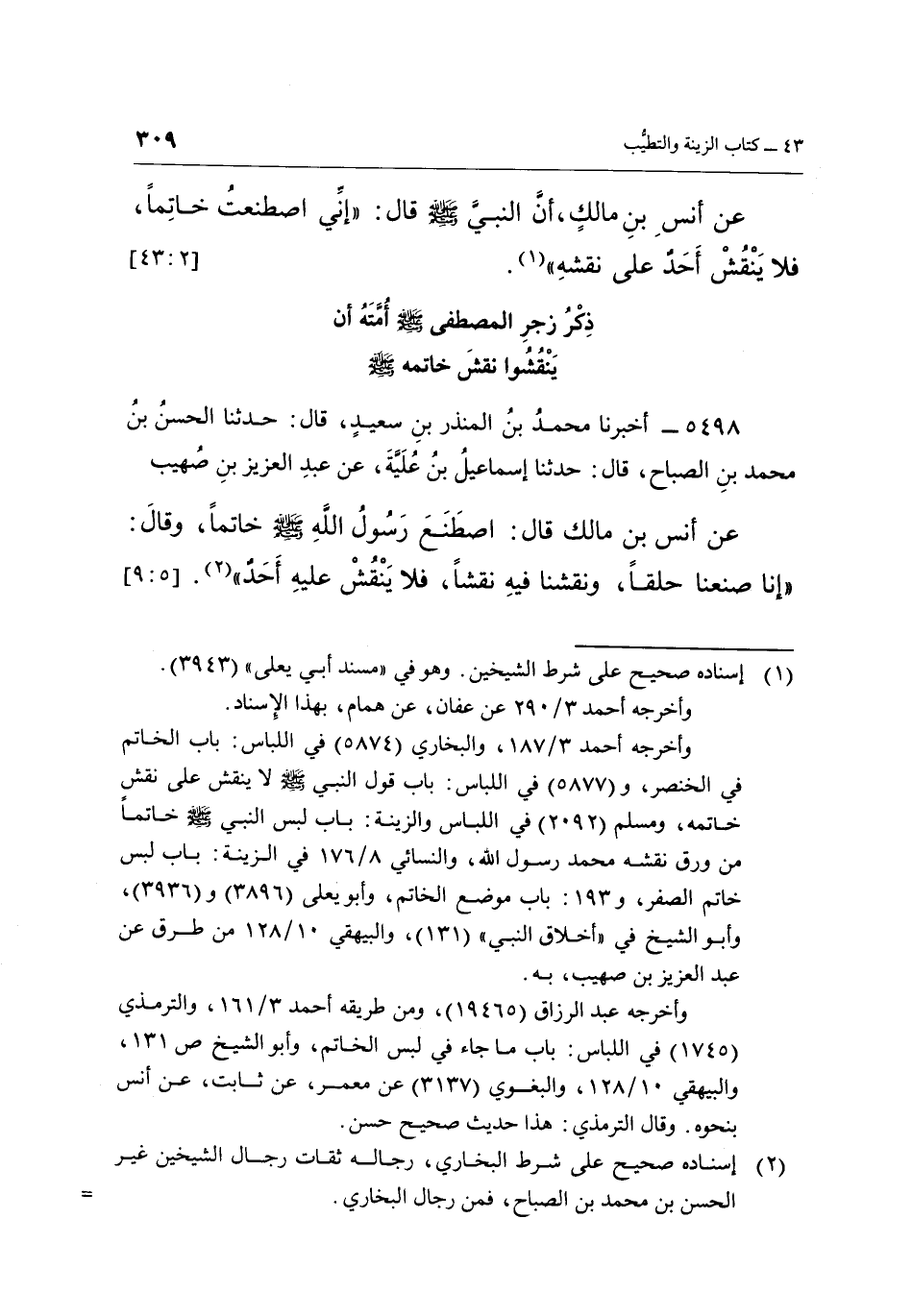 5498 - أَخْبَرَنَا مُحَمَّدُ بْنُ الْمُنْذِرِ بْنِ سَعِيدٍ، قَالَ: حَدَّثَنَا الْحَسَنُ بْنُ مُحَمَّدِ بْنِ الصَّبَّاحِ، قَالَ: حَدَّثَنَا إِسْمَاعِيلُ ابْنُ عُلَيَّةَ، عَنْ عَبْدِ الْعَزِيزِ بْنِ صُهَيْبٍ، عَنْ أَنَسِ بْنِ مَالِكٍ، قَالَ: اصْطَنَعَ رَسُولُ اللَّهِ صَلَّى اللَّهُ عَلَيْهِ وَسَلَّمَ خَاتَمًا، وَقَالَ: «إِنَّا صَنَعْنَا حِلْقًا وَنَقَشْنَا فِيهِ نَقْشًا، فَلَا يَنْقُشْ عَلَيْهِ أَحَدٌ» (¬2) . [5: 9]
