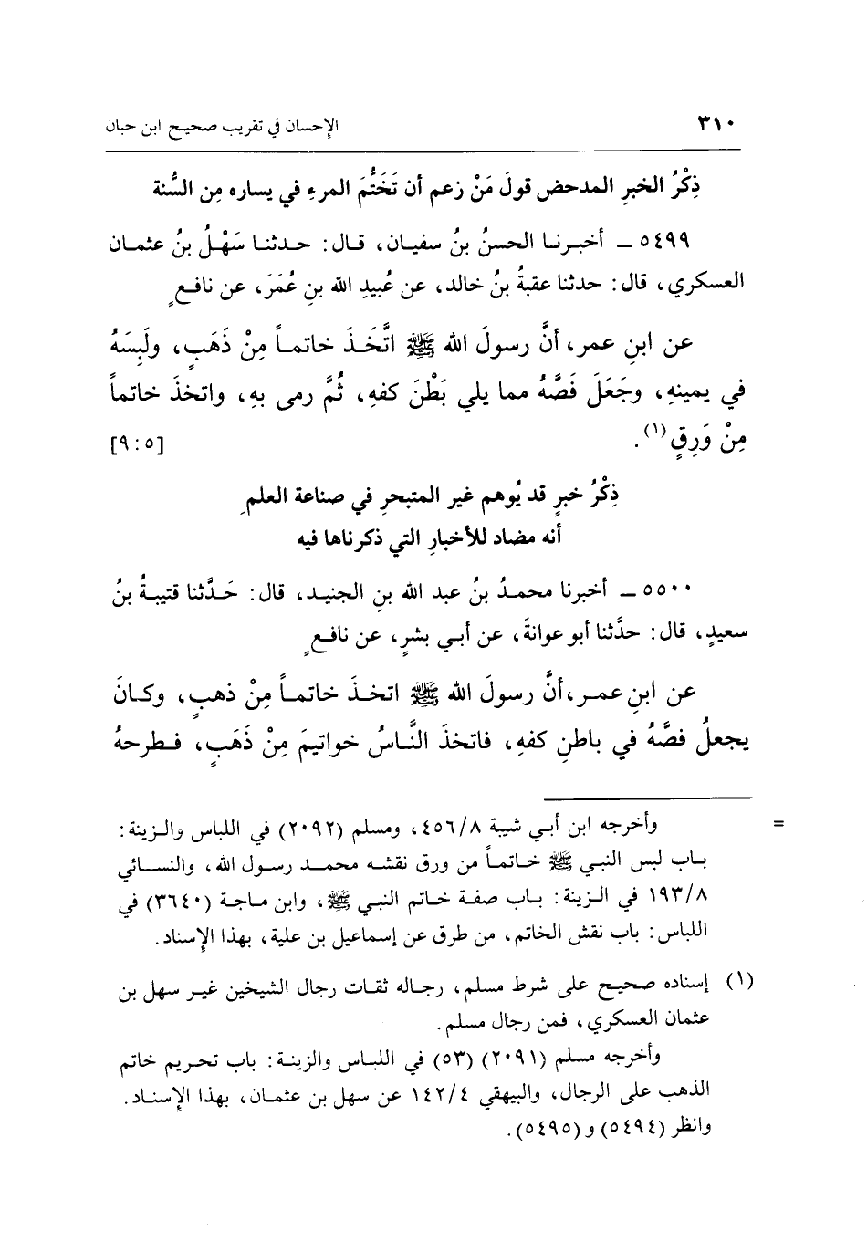 5499 - أَخْبَرَنَا الْحَسَنُ بْنُ سُفْيَانَ، قَالَ: حَدَّثَنَا سَهْلُ بْنُ عُثْمَانَ الْعَسْكَرِيُّ، قَالَ: حَدَّثَنَا عُقْبَةُ بْنُ خَالِدٍ، عَنْ عُبَيْدِ اللَّهِ بْنِ عُمَرَ، عَنْ نَافِعٍ عَنِ ابْنِ عُمَرَ، أَنَّ رَسُولَ اللَّهِ صَلَّى اللَّهُ عَلَيْهِ وَسَلَّمَ اتَّخَذَ خَاتَمًا مِنْ ذَهَبٍ، وَلَبِسَهُ فِي يَمِينِهِ، وَجَعَلَ فَصَّهُ مِمَّا يَلِي بَطْنَ كَفِّهِ، ثُمَّ رَمَى بِهِ، وَاتَّخَذَ خَاتَمًا مِنْ وَرِقٍ (¬1) . [5: 9]
