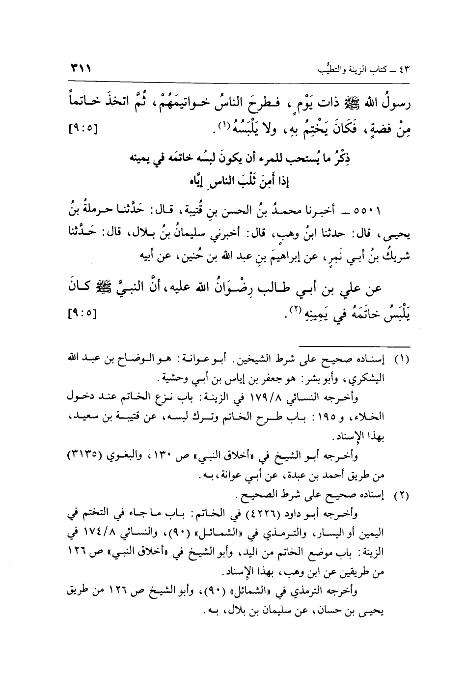 5501 - أَخْبَرَنَا مُحَمَّدُ بْنُ الْحَسَنِ بْنِ قُتَيْبَةَ، قَالَ: حَدَّثَنَا حَرْمَلَةُ بْنُ يَحْيَى، قَالَ: حَدَّثَنَا ابْنُ وَهْبٍ، قَالَ: أَخْبَرَنِي سُلَيْمَانُ بْنُ بِلَالٍ، قَالَ: حَدَّثَنَا شَرِيكُ بْنُ أَبِي نَمِرٍ، عَنْ إِبْرَاهِيمَ بْنِ عَبْدِ اللَّهِ بْنِ حُنَيْنٍ، عَنْ أَبِيهِ عَنْ عَلِيِّ بْنِ أَبِي طَالِبٍ رِضْوَانُ اللَّهِ عَلَيْهِ، أَنَّ النَّبِيَّ صَلَّى اللَّهُ عَلَيْهِ وَسَلَّمَ كَانَ يَلْبَسُ خَاتَمَهُ فِي يَمِينِهِ (¬2) . [5: 9]