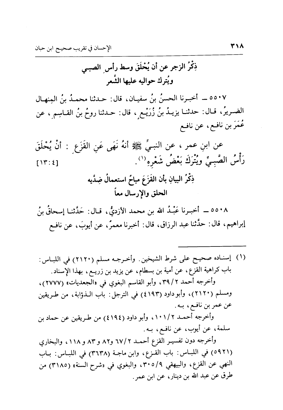 5507 - أَخْبَرَنَا الْحَسَنُ بْنُ سُفْيَانَ، قَالَ: حَدَّثَنَا مُحَمَّدُ بْنُ الْمِنْهَالِ الضَّرِيرُ، قَالَ: حَدَّثَنَا يَزِيدُ بْنُ زُرَيْعٍ، قَالَ: حَدَّثَنَا رَوْحُ بْنُ الْقَاسِمِ، عَنْ عُمَرَ بْنِ نَافِعٍ عَنْ نَافِعٍ، عَنِ ابْنِ عُمَرَ، عَنِ النَّبِيِّ صَلَّى اللَّهُ عَلَيْهِ وَسَلَّمَ: أَنَّهُ نَهَى عَنِ الْقَزَعِ: أَنْ يُحْلَقَ رَأْسُ الصَّبِيِّ وَيُتْرَكَ بَعْضُ شَعْرِهِ (¬1) . [4: 13]