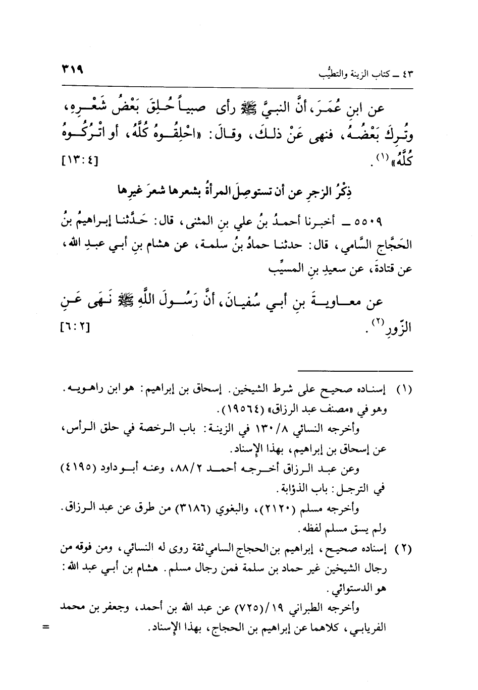 5509 - أَخْبَرَنَا أَحْمَدُ بْنُ عَلِيِّ بْنِ الْمُثَنَّى، قَالَ: حَدَّثَنَا إِبْرَاهِيمُ بْنُ الْحَجَّاجِ السَّامِيُّ، قَالَ: حَدَّثَنَا حَمَّادُ بْنُ سَلَمَةَ، عَنْ هِشَامِ بْنِ أَبِي عَبْدِ اللَّهِ، عَنْ قَتَادَةَ، عَنْ سَعِيدِ بْنِ الْمُسَيِّبِ عَنْ مُعَاوِيَةَ بْنِ أَبِي سُفْيَانَ، أَنَّ رَسُولَ اللَّهِ صَلَّى اللَّهُ عَلَيْهِ وَسَلَّمَ نَهَى عَنِ الزُّورِ (¬2) . [2: 6]