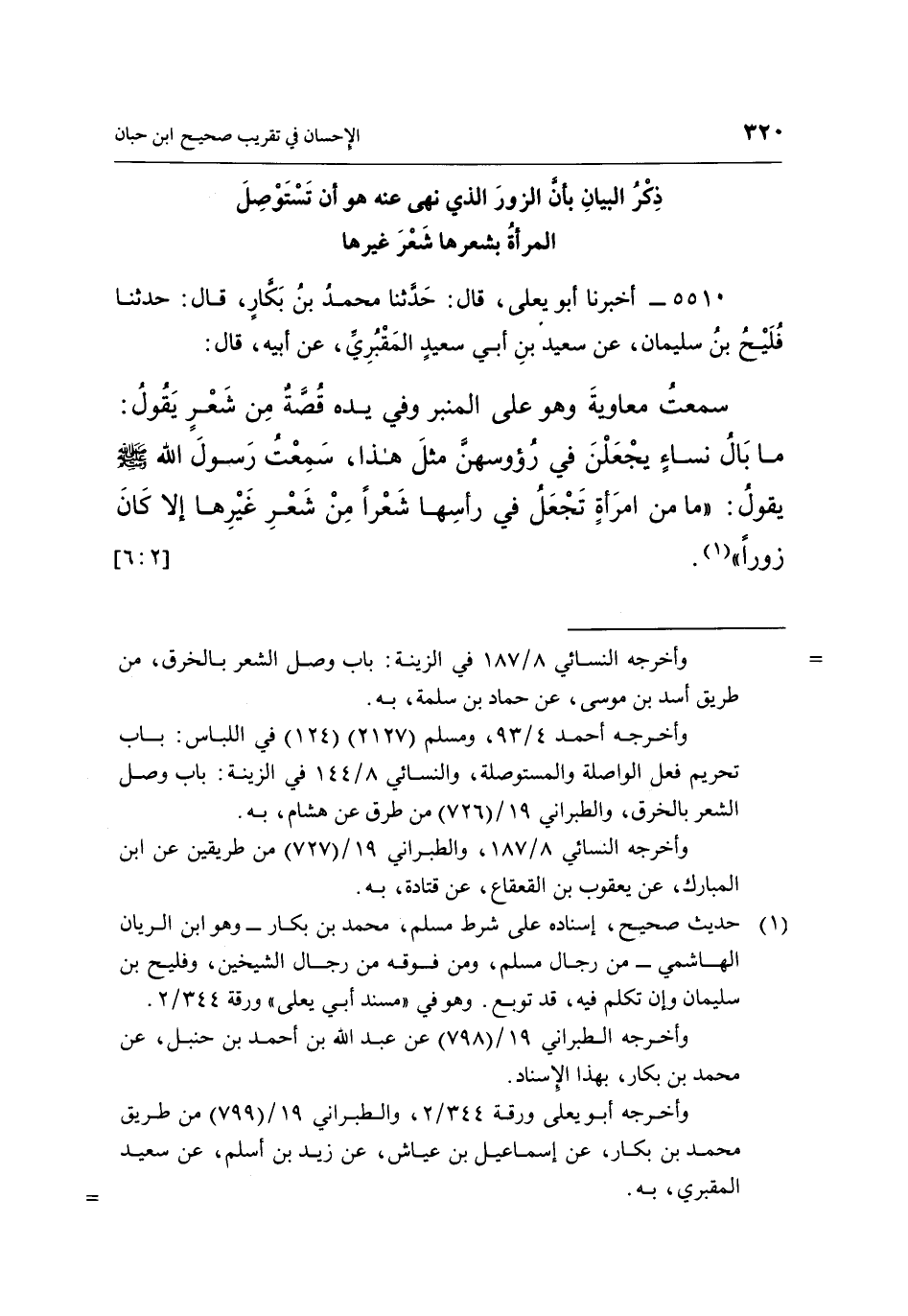 5510 - أَخْبَرَنَا أَبُو يَعْلَى، قَالَ: حَدَّثَنَا مُحَمَّدُ بْنُ بَكَّارٍ، قَالَ: حَدَّثَنَا فُلَيْحُ بْنُ سُلَيْمَانَ، عَنْ سَعِيدِ بْنِ أَبِي سَعِيدٍ الْمَقْبُرِيِّ، عَنْ أَبِيهِ، قَالَ: سَمِعْتُ مُعَاوِيَةَ وَهُوَ عَلَى الْمِنْبَرِ وَفِي يَدِهِ قُصَّةٌ مِنْ شَعْرٍ يَقُولُ: مَا بَالُ نِسَاءٍ يَجْعَلْنَ فِي رُءُوسِهِنَّ مِثْلَ هَذَا، سَمِعْتُ رَسُولَ اللَّهِ صَلَّى اللَّهُ عَلَيْهِ وَسَلَّمَ يَقُولُ: «مَا مِنِ امْرَأَةٍ تَجْعَلُ فِي رَأْسِهَا شَعْرًا مِنْ شَعْرِ غَيْرِهَا، إِلَّا كَانَ زُورًا» (¬1) . [2: 6]