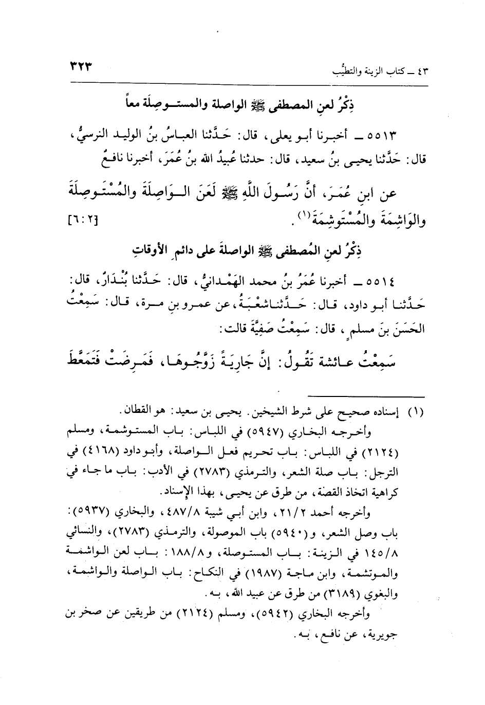 5513 - أَخْبَرَنَا أَبُو يَعْلَى، قَالَ: حَدَّثَنَا الْعَبَّاسُ بْنُ الْوَلِيدِ النَّرْسِيُّ، قَالَ: حَدَّثَنَا يَحْيَى بْنُ سَعِيدٍ، قَالَ: حَدَّثَنَا عُبَيْدُ اللَّهِ بْنُ عُمَرَ، أَخْبَرَنَا نَافِعٌ عَنِ ابْنِ عُمَرَ، أَنَّ رَسُولَ اللَّهِ صَلَّى اللَّهُ عَلَيْهِ وَسَلَّمَ لَعَنَ الْوَاصِلَةَ وَالْمُسْتَوْصِلَةَ وَالْوَاشِمَةَ وَالْمُسْتَوْشِمَةَ (¬1) . [2: 6]