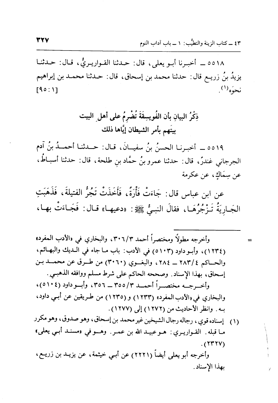 5519 - أَخْبَرَنَا الْحَسَنُ بْنُ سُفْيَانَ، قَالَ: حَدَّثَنَا أَحْمَدُ بْنُ آدَمَ الْجُرْجَانِيُّ غُنْدَرٌ، قَالَ: حَدَّثَنَا عَمْرُو بْنُ حَمَّادِ بْنِ طَلْحَةَ، قَالَ: حَدَّثَنَا أَسْبَاطٌ، عَنْ سِمَاكٍ، عَنْ عِكْرِمَةَ عَنِ ابْنِ عَبَّاسٍ قَالَ: جَاءَتْ فَأَرَةٌ، فَأَخَذَتْ تَجُرُّ الْفَتِيلَةَ، فَذَهَبَتِ الْجَارِيَةُ تَزْجُرُهَا، فَقَالَ النَّبِيُّ صَلَّى اللَّهُ عَلَيْهِ وَسَلَّمَ: «دَعِيهَا» قَالَ: فَجَاءَتْ بِهَا،