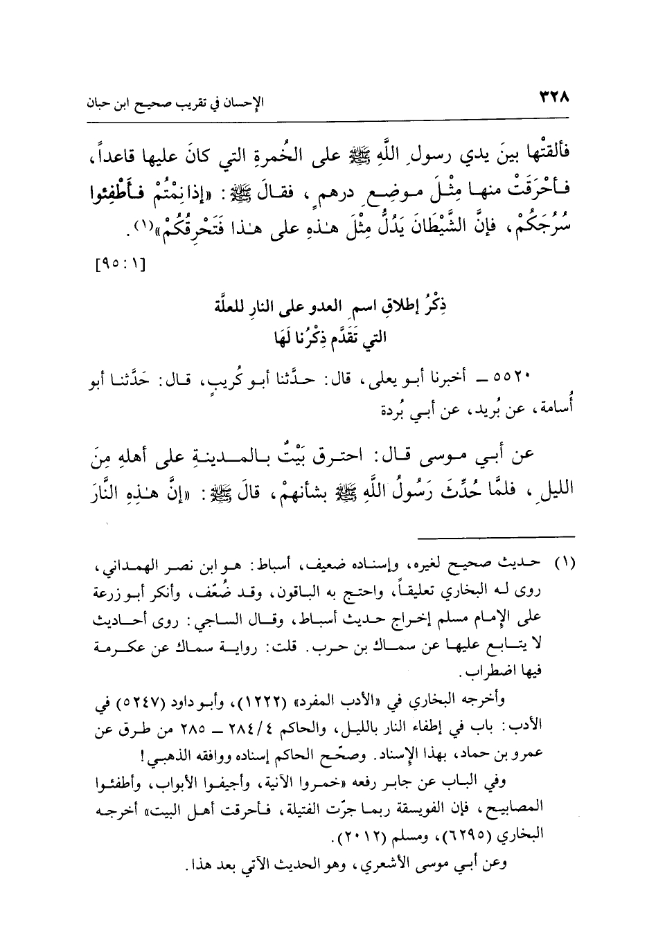 5520 - أَخْبَرَنَا أَبُو يَعْلَى، قَالَ: حَدَّثَنَا أَبُو كُرَيْبٍ، قَالَ: حَدَّثَنَا أَبُو أُسَامَةَ، عَنْ بُرَيْدٍ، عَنْ أَبِي بُرْدَةَ عَنْ أَبِي مُوسَى، قَالَ: احْتَرَقَ بَيْتٌ بِالْمَدِينَةِ عَلَى أَهْلِهِ مِنَ اللَّيْلِ، فَلَمَّا حُدِّثَ رَسُولُ اللَّهِ صَلَّى اللَّهُ عَلَيْهِ وَسَلَّمَ بِشَأْنِهِمْ، قَالَ صَلَّى اللَّهُ عَلَيْهِ وَسَلَّمَ: «إِنَّ هَذِهِ النَّارَ