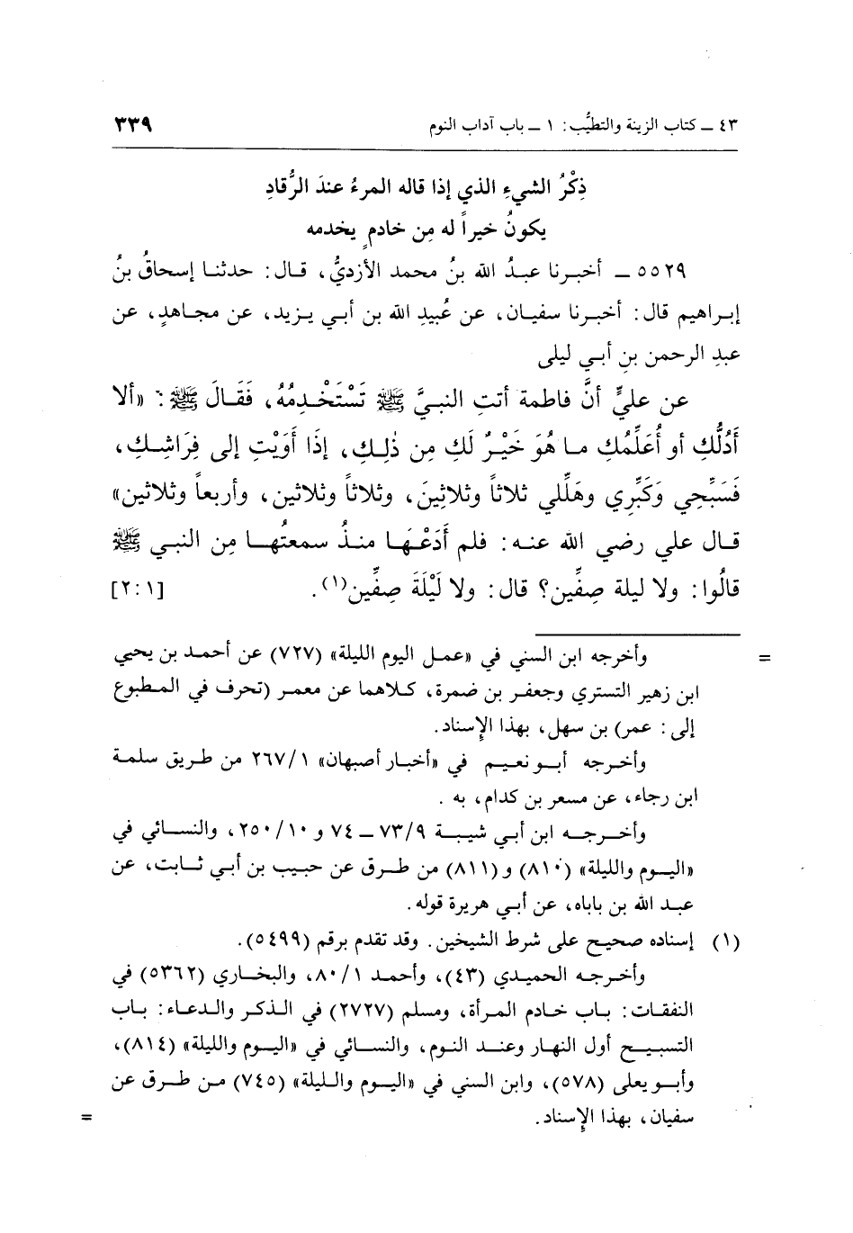 5529 - أَخْبَرَنَا عَبْدُ اللَّهِ بْنُ مُحَمَّدٍ الْأَزْدِيُّ، قَالَ: حَدَّثَنَا إِسْحَاقُ بْنُ إِبْرَاهِيمَ، قَالَ: أَخْبَرَنَا سُفْيَانُ، عَنْ عُبَيْدِ اللَّهِ بْنِ أَبِي يَزِيدَ، عَنْ مُجَاهِدٍ، عَنْ عَبْدِ الرَّحْمَنِ بْنِ أَبِي لَيْلَى عَنْ عَلِيٍّ أَنَّ فَاطِمَةَ أَتَتِ النَّبِيَّ صَلَّى اللَّهُ عَلَيْهِ وَسَلَّمَ تَسْتَخْدِمُهُ، فَقَالَ صَلَّى اللَّهُ عَلَيْهِ وَسَلَّمَ: "أَلَا أَدُلُّكِ أَوْ أُعَلِّمُكِ مَا هُوَ خَيْرٌ لَكِ مِنْ ذَلِكَ، إِذَا أَوَيْتِ إِلَى فِرَاشِكِ، فَسَبِّحِي وَكَبِّرِي وَهَلِّلِي ثَلَاثًا وَثَلَاثِينَ، وَثَلَاثًا وَثَلَاثِينَ، وَأَرْبَعًا وَثَلَاثِينَ" قَالَ عَلِيٌّ رَضِيَ اللَّهُ عَنْهُ: فَلَمْ أَدَعْهَا مُنْذُ سَمِعْتُهَا مِنَ النَّبِيِّ صَلَّى اللَّهُ عَلَيْهِ وَسَلَّمَ، قَالُوا: وَلَا لَيْلَةَ صِفِّينَ؟ قَالَ: وَلَا لَيْلَةَ صِفِّينَ (¬1) . [1: 2]