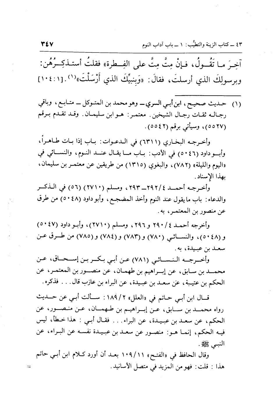 آخِرَ مَا تَقُولُ، فَإِنْ مِتَّ مِتَّ عَلَى الْفِطْرَةِ» فَقُلْتُ: أَسْتَذْكِرُهُنَّ: وَبِرَسُولِكَ الَّذِي أَرْسَلْتَ، فَقَالَ: «وَبِنَبِيِّكَ الَّذِي أَرْسَلْتَ» (¬1) . [1: 104]