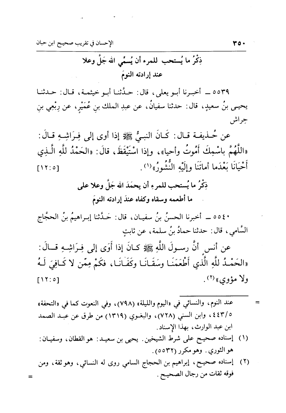 5539 - أَخْبَرَنَا أَبُو يَعْلَى، قَالَ: حَدَّثَنَا أَبُو خَيْثَمَةَ، قَالَ: حَدَّثَنَا يَحْيَى بْنُ سَعِيدٍ، قَالَ: حَدَّثَنَا سُفْيَانُ، عَنْ عَبْدِ الْمَلِكِ بْنِ عُمَيْرٍ، عَنْ رِبْعِيِّ بْنِ حِرَاشٍ عَنْ حُذَيْفَةَ، قَالَ: كَانَ النَّبِيُّ صَلَّى اللَّهُ عَلَيْهِ وَسَلَّمَ إِذَا أَوَى إِلَى فِرَاشِهِ، قَالَ: «اللَّهُمَّ بِاسْمِكَ أَمُوتُ وَأَحْيَا» وَإِذَا اسْتَيْقَظَ قَالَ: «الْحَمْدُ لِلَّهِ الَّذِي أَحْيَانَا بَعْدَمَا أَمَاتَنَا وَإِلَيْهِ النُّشُورُ» (¬1) . [5: 12]
