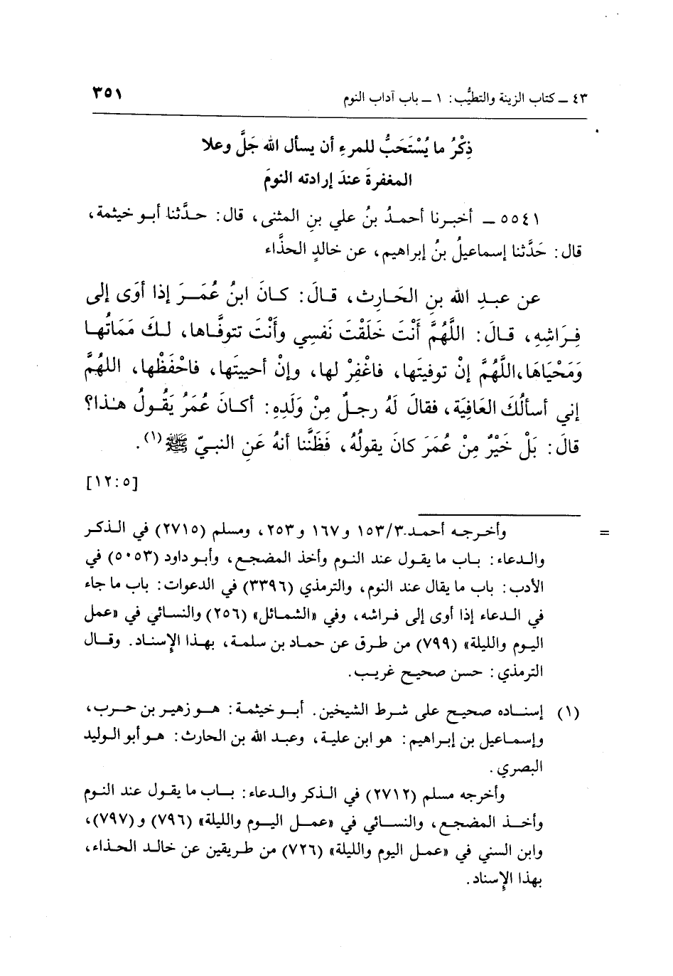 عَنْ عَبْدِ اللَّهِ بْنِ الْحَارِثِ، قَالَ: كَانَ ابْنُ عُمَرَ إِذَا أَوَى إِلَى فِرَاشِهِ قَالَ: «اللَّهُمَّ أَنْتَ خَلَقْتَ نَفْسِي وَأَنْتَ تَتَوَفَّاهَا، لَكَ مَمَاتُهَا وَمَحْيَاهَا، اللَّهُمَّ إِنْ تَوَفَّيْتَهَا فَاغْفِرْ لَهَا، وَإِنْ أَحْيَيْتَهَا فَاحْفَظْهَا، اللَّهُمَّ إِنِّي أَسْأَلُكَ الْعَافِيَةَ» فَقَالَ لَهُ رَجُلٌ مِنْ وَلَدِهِ: أَكَانَ عُمَرُ يَقُولُ هَذَا؟ قَالَ: بَلْ خَيْرٌ مِنْ عُمَرَ كَانَ يَقُولُهُ، فَظَنَنَّا أَنَّهُ عَنِ النَّبِيِّ صَلَّى اللَّهُ عَلَيْهِ وَسَلَّمَ (¬1) . [5: 12]