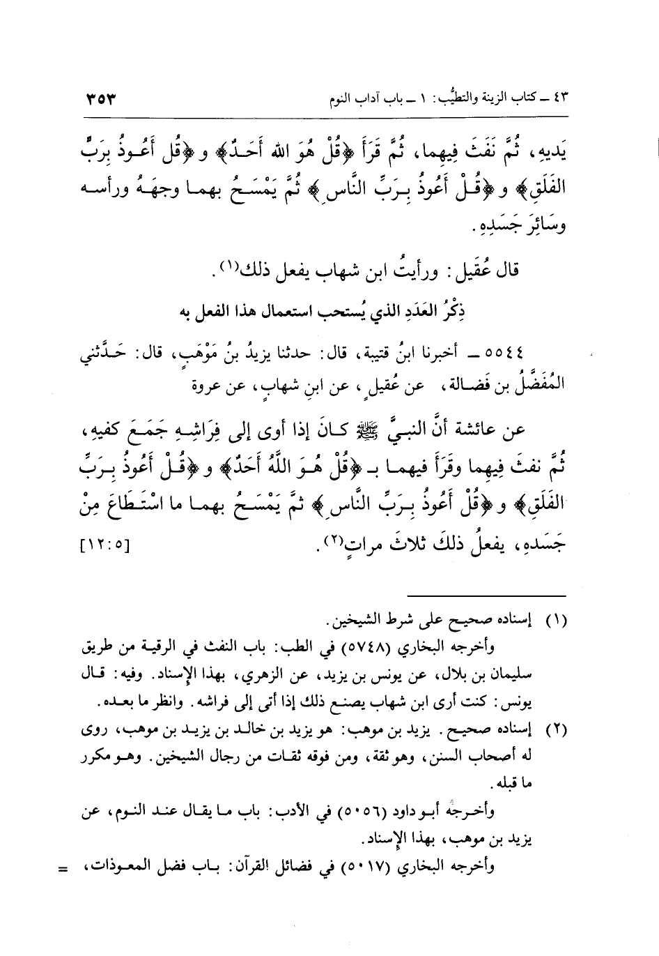 5544 - أَخْبَرَنَا ابْنُ قُتَيْبَةَ، قَالَ: حَدَّثَنَا يَزِيدُ بْنُ مَوْهَبٍ، قَالَ: حَدَّثَنِي الْمُفَضَّلُ بْنُ فَضَالَةَ، عَنْ عَقِيلٍ، عَنِ ابْنِ شِهَابٍ، عَنْ عُرْوَةَ عَنْ عَائِشَةَ «أَنَّ النَّبِيَّ صَلَّى اللَّهُ عَلَيْهِ وَسَلَّمَ كَانَ إِذَا أَوَى إِلَى فِرَاشِهِ جَمَعَ كَفَّيْهِ ثُمَّ نَفَثَ فِيهِمَا، وَقَرَأَ فِيهِمَا بِـ {قُلْ هُوَ اللَّهُ أَحَدٌ} وَ {قُلْ أَعُوذُ بِرَبِّ الْفَلَقِ} وَ {قُلْ أَعُوذُ بِرَبِّ النَّاسِ} ثُمَّ يَسْمَحُ بِهِمَا مَا اسْتَطَاعَ مِنْ جَسَدِهِ، يَفْعَلُ ذَلِكَ ثَلَاثَ مَرَّاتٍ (¬2) . [5: 12]