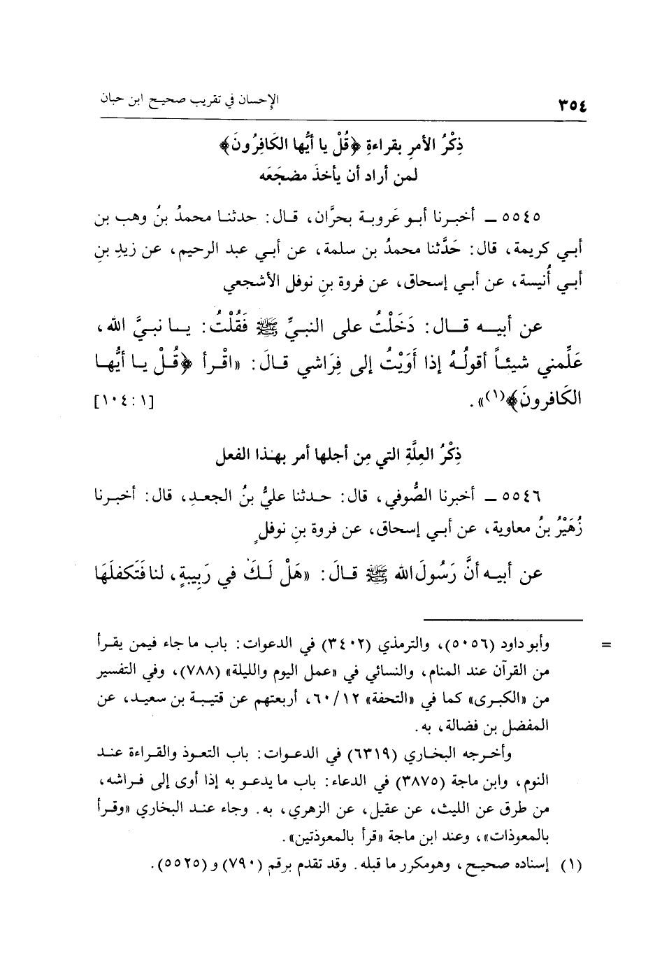 5545 - أَخْبَرَنَا أَبُو عَرُوبَةَ، بِحَرَّانَ، قَالَ: حَدَّثَنَا مُحَمَّدُ بْنُ وَهْبِ بْنِ أَبِي كَرِيمَةَ، قَالَ: حَدَّثَنَا مُحَمَّدُ بْنُ سَلَمَةَ، عَنْ أَبِي عَبْدِ الرَّحِيمِ، عَنْ زَيْدِ بْنِ أَبِي أُنَيْسَةَ، عَنْ أَبِي إِسْحَاقَ، عَنْ فَرْوَةَ بْنِ نَوْفَلٍ الْأَشْجَعِيِّ عَنْ أَبِيهِ، قَالَ: دَخَلْتُ عَلَى النَّبِيِّ صَلَّى اللَّهُ عَلَيْهِ وَسَلَّمَ، فَقُلْتُ: يَا نَبِيَّ اللَّهِ، عَلِّمْنِي شَيْئًا أَقُولُهُ إِذَا أَوَيْتُ إِلَى فِرَاشِي، قَالَ: « {اقْرَأْ قُلْ يَا أَيُّهَا الْكَافِرُونَ} » (¬1) . [1: 104]