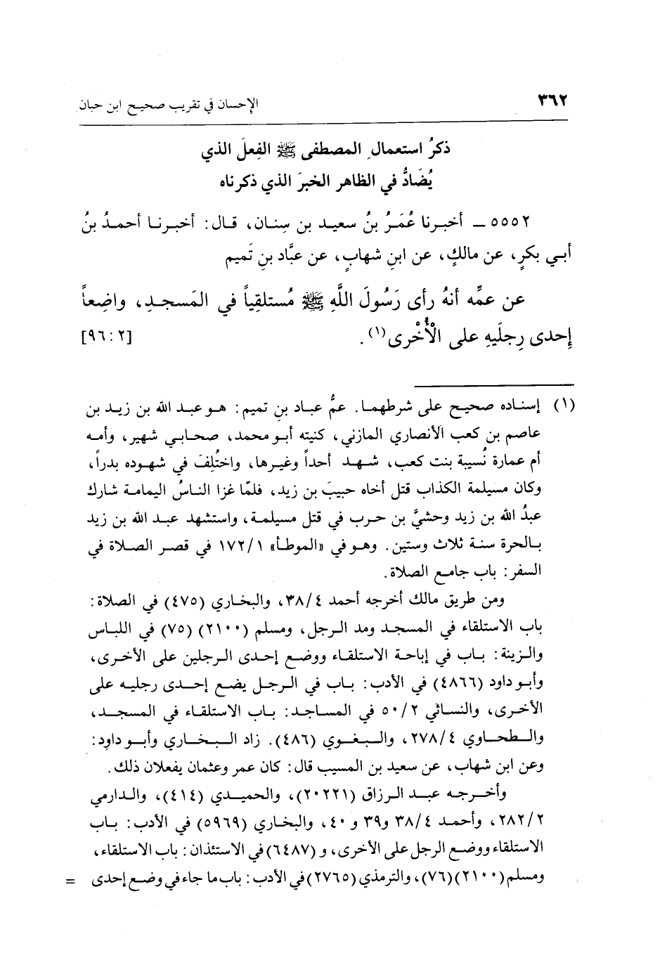 5552 - أَخْبَرَنَا عُمَرُ بْنُ سَعِيدِ بْنِ سِنَانٍ، قَالَ: أَخْبَرَنَا أَحْمَدُ بْنُ أَبِي بَكْرٍ، عَنْ مَالِكٍ، عَنِ ابْنِ شِهَابٍ، عَنْ عَبَّادِ بْنِ تَمِيمٍ عَنْ عَمِّهِ، أَنَّهُ رَأَى رَسُولَ اللَّهِ صَلَّى اللَّهُ عَلَيْهِ وَسَلَّمَ مُسْتَلْقِيًا فِي الْمَسْجِدِ وَاضِعًا إِحْدَى رِجْلَيْهِ عَلَى الْأُخْرَى (¬1) . [2: 96]
