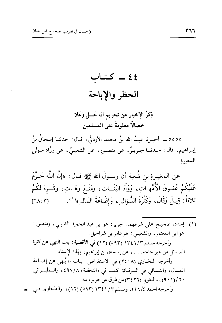 5555 - أَخْبَرَنَا عَبْدُ اللَّهِ بْنُ مُحَمَّدٍ الْأَزْدِيُّ، قَالَ: حَدَّثَنَا إِسْحَاقُ بْنُ إِبْرَاهِيمَ، قَالَ: حَدَّثَنَا جَرِيرٌ، عَنْ مَنْصُورٍ، عَنِ الشَّعْبِيِّ، عَنْ وَرَّادٍ، مَوْلَى الْمُغِيرَةِ عَنِ الْمُغِيرَةِ بْنِ شُعْبَةَ، أَنَّ رَسُولَ اللَّهِ صَلَّى اللَّهُ عَلَيْهِ وَسَلَّمَ قَالَ: «إِنَّ اللَّهَ حَرَّمَ عَلَيْكُمْ عُقُوقَ الْأُمَّهَاتِ، وَوَأْدَ الْبَنَاتِ، وَمَنَعَ وَهَاتِ، وَكَرِهَ لَكُمْ ثَلَاثًا: قِيلَ وَقَالَ، وَكَثْرَةَ السُّؤَالِ، وَإِضَاعَةَ الْمَالِ» (¬1) . [3: 68]