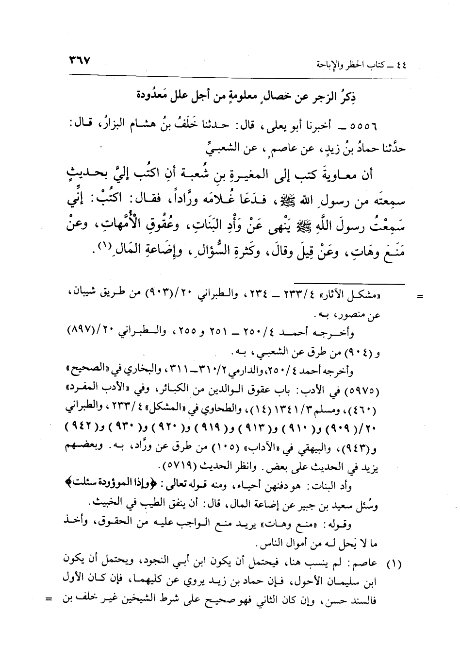 5556 - أَخْبَرَنَا أَبُو يَعْلَى، قَالَ: حَدَّثَنَا خَلَفُ بْنُ هِشَامٍ الْبَزَّارُ، قَالَ: حَدَّثَنَا حَمَّادُ بْنُ زَيْدٍ، عَنْ عَاصِمٍ، عَنِ الشَّعْبِيِّ أَنَّ مُعَاوِيَةَ، كَتَبَ إِلَى الْمُغِيرَةِ بْنِ شُعْبَةَ أَنِ اكْتُبْ إِلَيَّ بِحَدِيثٍ سَمِعْتَهُ مِنْ رَسُولِ اللَّهِ صَلَّى اللَّهُ عَلَيْهِ وَسَلَّمَ، فَدَعَا غُلَامَهُ وَرَّادًا، فَقَالَ: اكْتُبْ: إِنِّي سَمِعْتُ رَسُولَ اللَّهِ صَلَّى اللَّهُ عَلَيْهِ وَسَلَّمَ يَنْهَى عَنْ وَأْدِ الْبَنَاتِ، وَعُقُوقِ الْأُمَّهَاتِ، وَعَنْ مَنْعٍ وَهَاتِ، وَعَنْ قِيلَ وَقَالَ، وَكَثْرَةِ السُّؤَالِ، وَإِضَاعَةِ الْمَالِ (¬1) .
