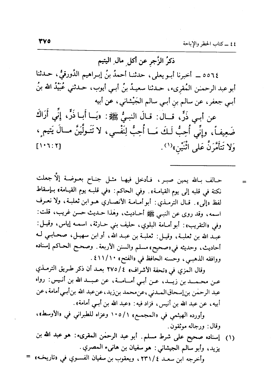 5564 - أَخْبَرَنَا أَبُو يَعْلَى، حَدَّثَنَا أَحْمَدُ بْنُ إِبْرَاهِيمَ الدَّوْرَقِيُّ، حَدَّثَنَا أَبُو عَبْدِ الرَّحْمَنِ الْمُقْرِئُ، حَدَّثَنَا سَعِيدُ بْنُ أَبِي أَيُّوبَ، حَدَّثَنِي عُبَيْدُ اللَّهِ بْنُ أَبِي جَعْفَرٍ، عَنْ سَالِمِ بْنِ أَبِي سَالِمٍ الْجَيْشَانِيِّ، عَنْ أَبِيهِ عَنْ أَبِي ذَرٍّ، قَالَ: قَالَ النَّبِيُّ صَلَّى اللَّهُ عَلَيْهِ وَسَلَّمَ: «يَا أَبَا ذَرٍّ، إِنِّي أَرَاكَ ضَعِيفًا، وَإِنِّي أُحِبُّ لَكَ مَا أُحِبُّ لِنَفْسِي، لَا تَتَوَلَّيَنَّ مَالَ يَتِيمٍ، وَلَا تَتَأَمَّرَنَّ عَلَى اثْنَيْنِ» (¬1) . [2: 106]