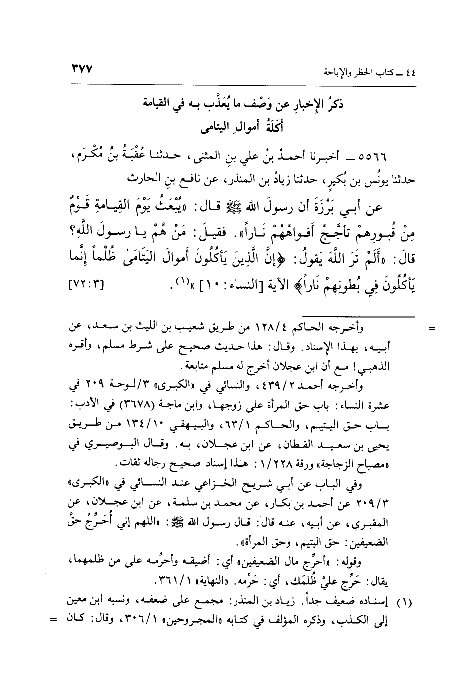 5566 - أَخْبَرَنَا أَحْمَدُ بْنُ عَلِيِّ بْنِ الْمُثَنَّى، حَدَّثَنَا عُقْبَةُ بْنُ مُكْرَمٍ، حَدَّثَنَا يُونُسُ بْنُ بُكَيْرٍ، حَدَّثَنَا زِيَادُ بْنُ الْمُنْذِرِ، عَنْ نَافِعِ بْنِ الْحَارِثِ عَنْ أَبِي بَرْزَةَ، أَنَّ رَسُولَ اللَّهِ صَلَّى اللَّهُ عَلَيْهِ وَسَلَّمَ قَالَ: «يُبْعَثُ يَوْمَ الْقِيَامَةِ قَوْمٌ مِنْ قُبُورِهِمْ تَأَجَّجُ أَفْوَاهُهُمْ نَارًا» فَقِيلَ: مَنْ هُمْ يَا رَسُولَ اللَّهِ؟ قَالَ: «أَلَمْ تَرَ اللَّهَ يَقُولُ {إِنَّ الَّذِينَ يَأْكُلُونَ أَمْوَالَ الْيَتَامَى ظُلْمًا إِنَّمَا يَأْكُلُونَ فِي بُطُونِهِمْ نَارًا} الْآيَةَ [النساء: 10] » (¬1) . [3: 72]